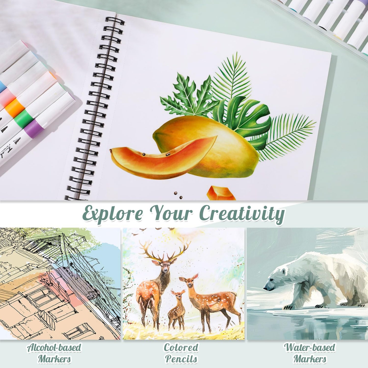 - 【Spiral Bound Marker Paper Sketchbook】Marker Paper Sketchbook features tear line technology - no scissors required to change pages in seconds. 360° spiral binding allows 180° flat use for seamless edge-to-edge drawing. Portable design fits in an art tote, perfect for park sketching or coffee shop creations