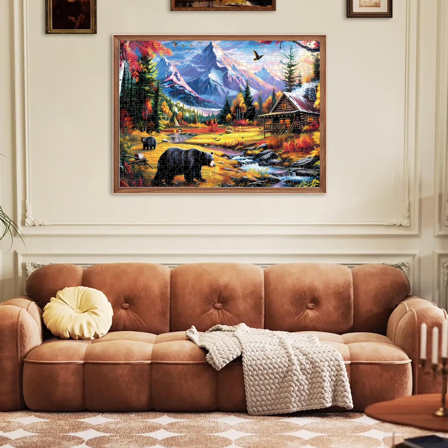 - Bear Jigsaw Puzzles for Adults: Bears strolls through the mountains, its powerful form contrasting with the serene landscape. In the distance, a cozy cabin sits nestled among the trees, adding a touch of rustic charm to the wild, untamed beauty of nature