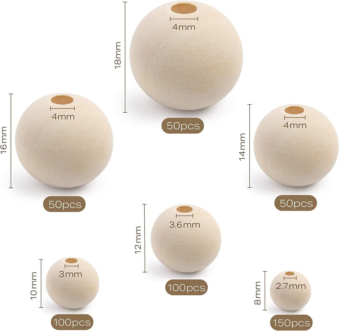 - Value Pack: Our set includes 500 pre-drilled wooden balls in 6 Sizes (150 x 8mm, 100 x 10mm, 100 x 12mm, 50 x 14mm, 50 x 16mm, 50 x 18mm); Each bead size is packed separately for convenience