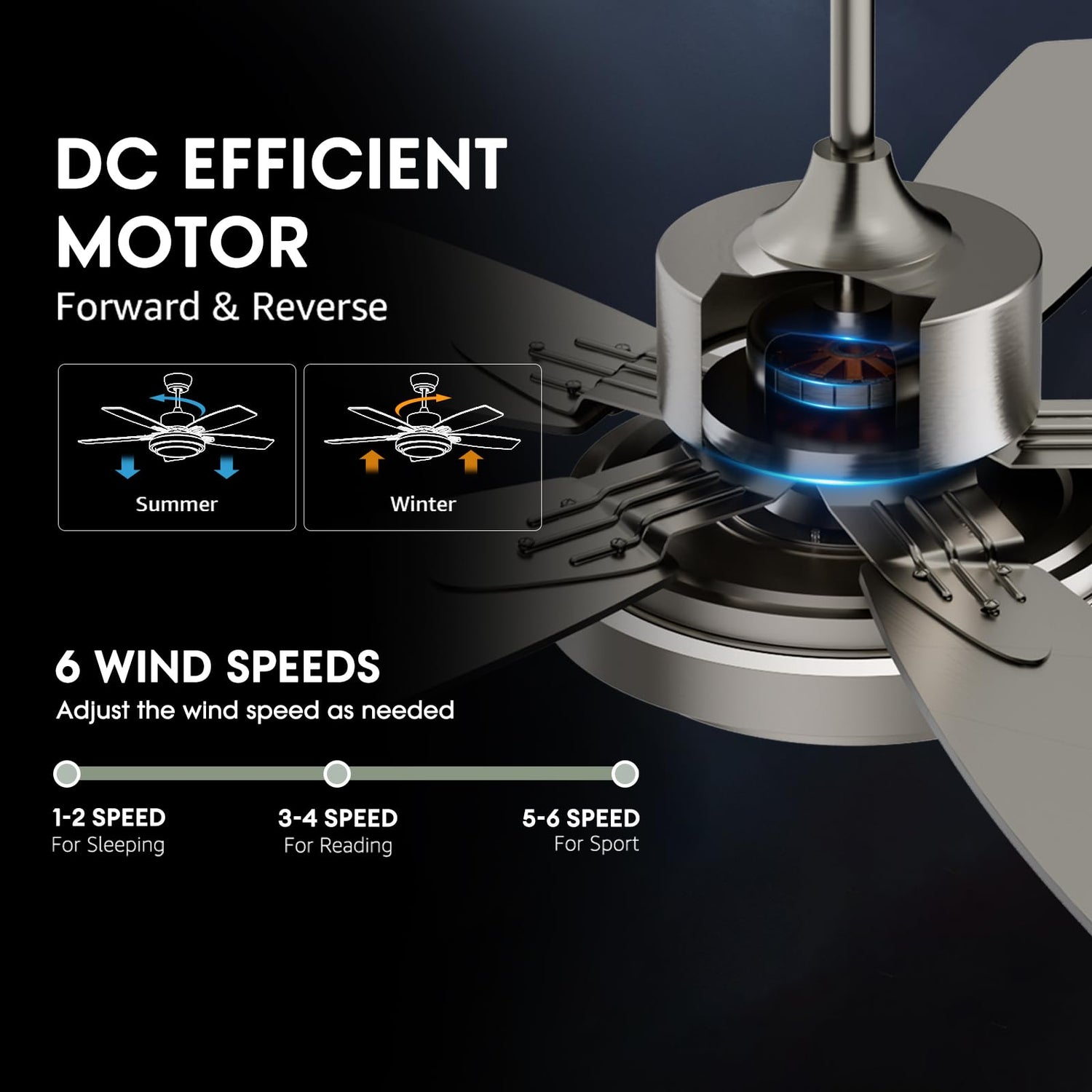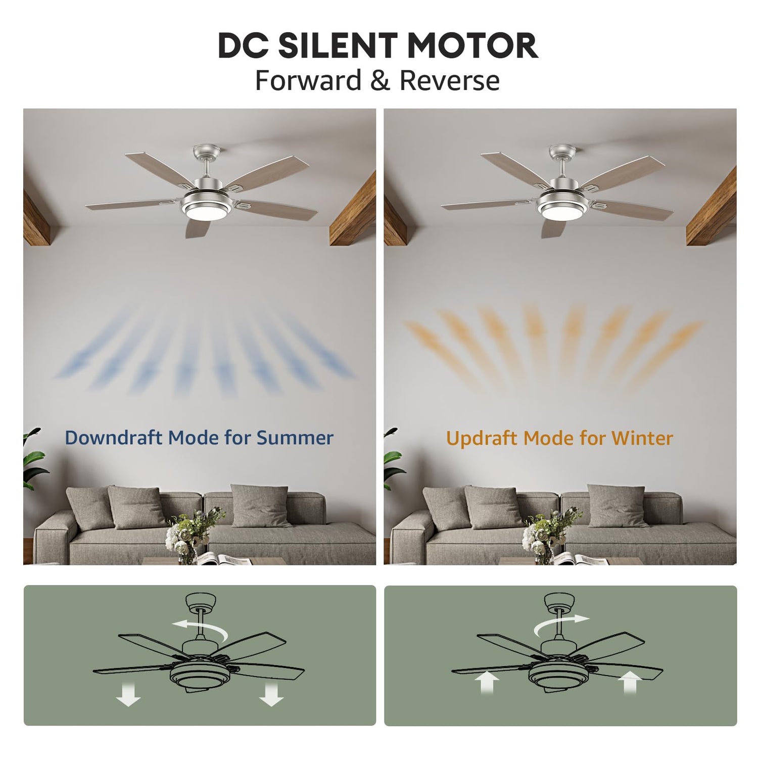 • 【Reversible DC MOTOR】The Nickel ceiling fan with light has a reversible DC motor, allowing you to change the direction on remote controller & APP from downdraft mode during the summer to updraft mode during the winter.
