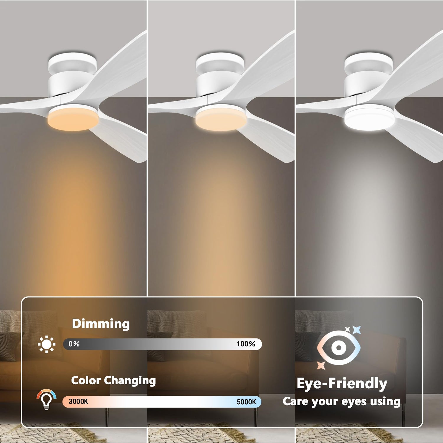 - 【75% Energy-efficient】 The white ceiling fan features 3 solid wood blades and a whisper-quiet DC motor. DC ceiling fan is typically 75% more energy-efficient than traditional AC fan, significantly reducing your electricity usage. The smart lighting & ceiling fans options, including auto-on/off schedule timer (0-8h), make it a great addition to your smart home, enhancing both convenience and energy savings.