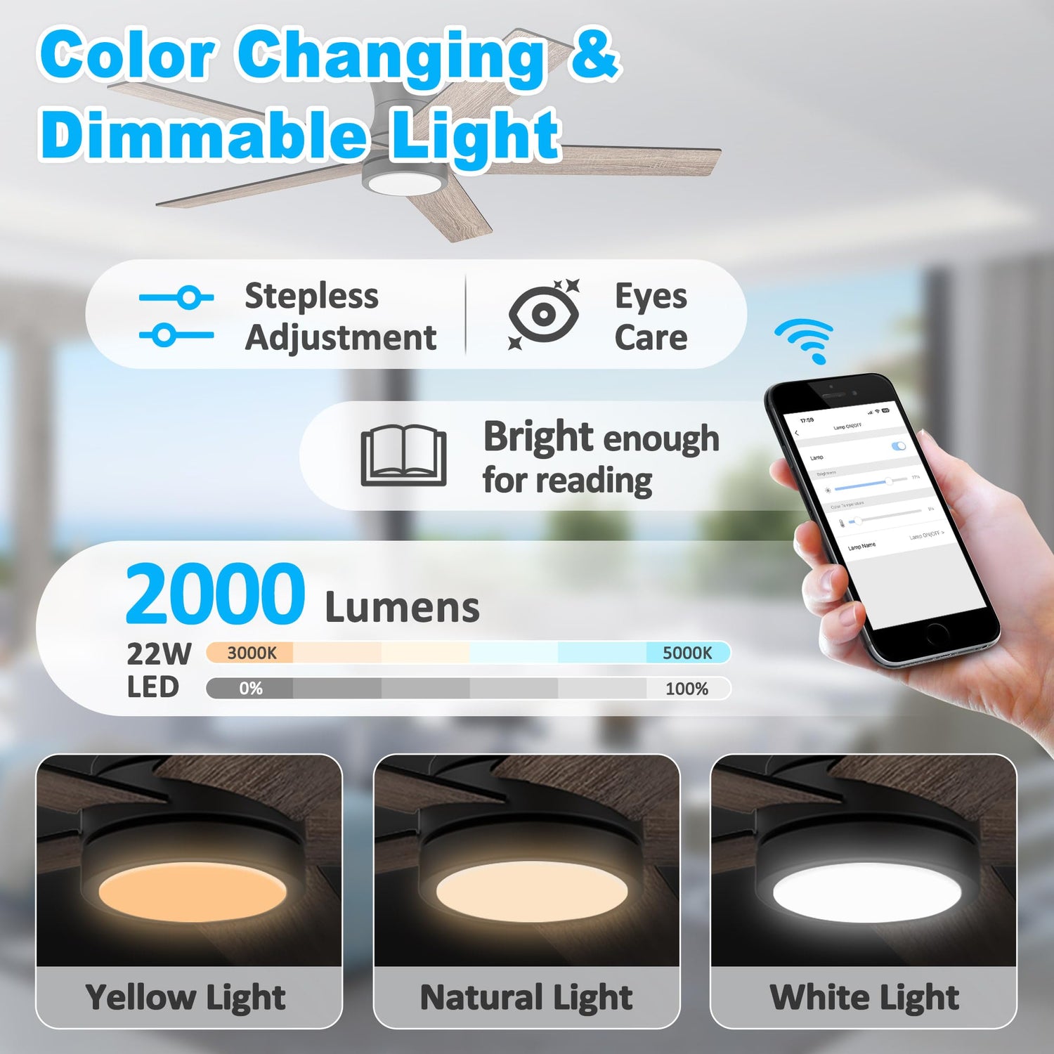 - 【Customized Brightness & Temperature】This 52 ceiling fans feature an customized led light, transforms your space with 3 modes on the remote(3000K warm yellow light, 4000K bright daylight, and 5000K cool white light).Adjust the brightness from 0-100%, and switch the color temperatures from white to yellow with app/remote, perfect for relaxation,work,entertainment. The google ceiling fan equips with long lifespan 2000 lumens led, gentle on your eyes while providing enough brightness for reading