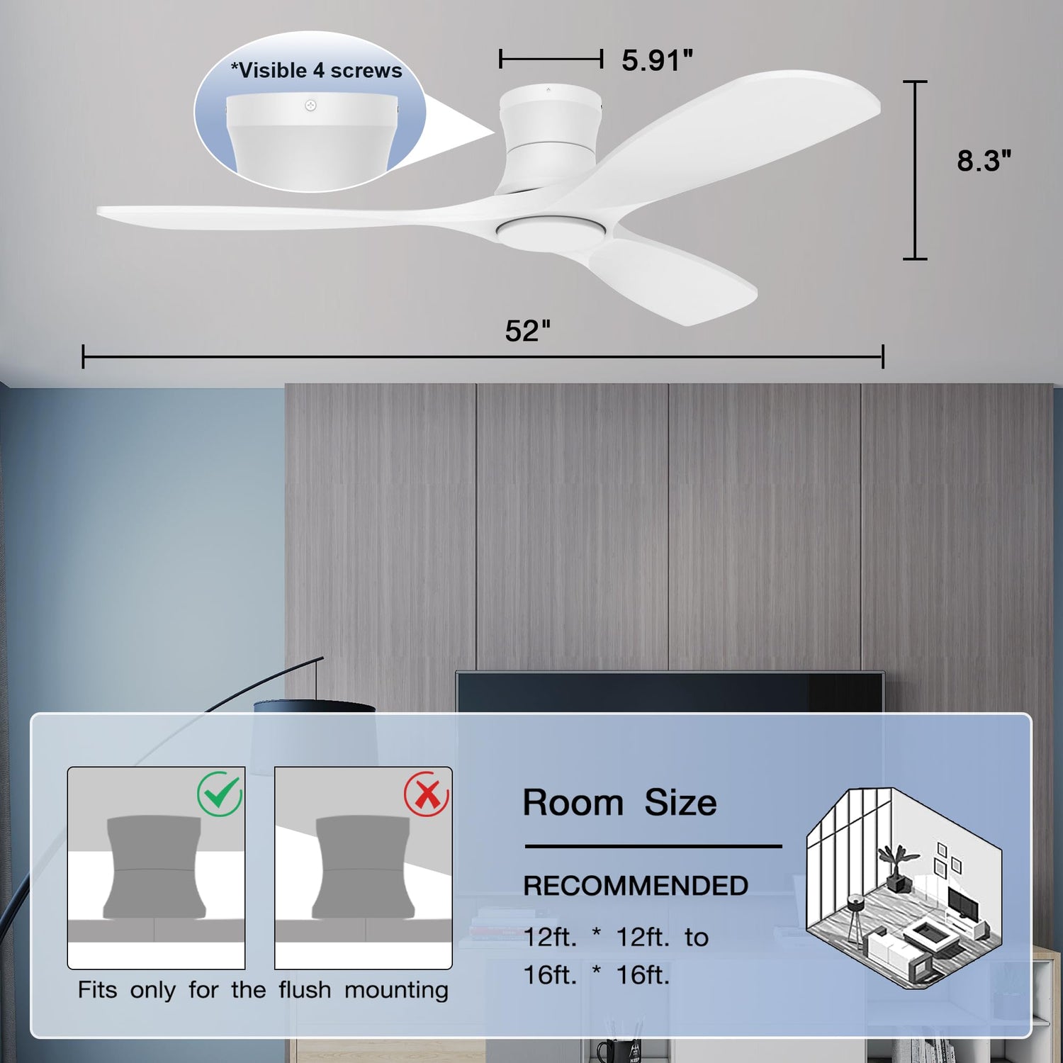 52in Smart Low Profile Ceiling Fans with Lights Remote,Quiet DC Motor,Outdoor Indoor Flush Mount Ceiling Fan,Control with WIFI Alexa App,Dimmable,6-speed,3 White Wood blades,for Modern Bedroom Patio