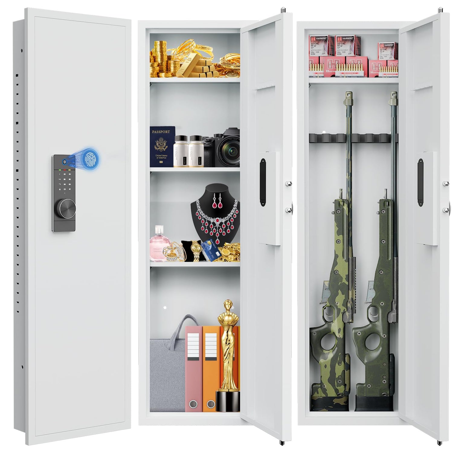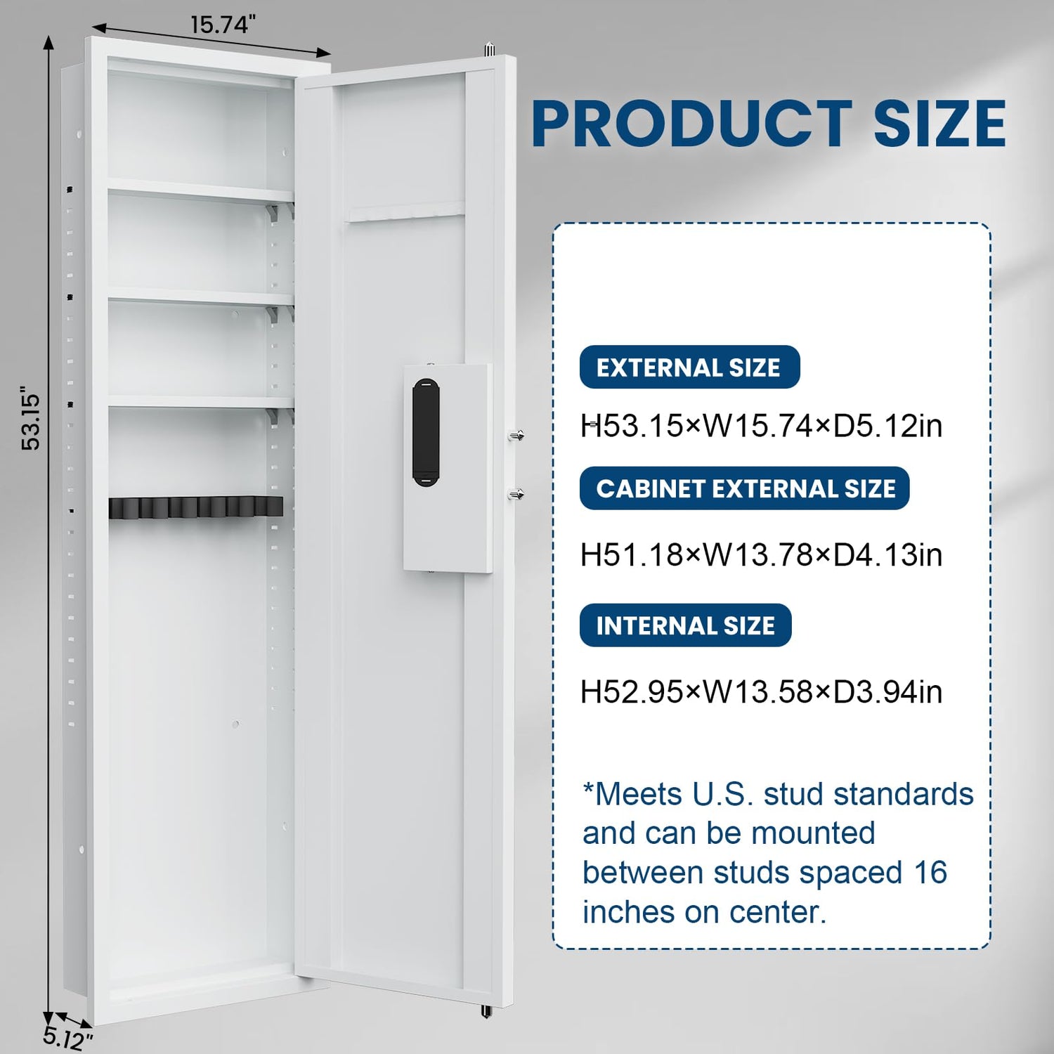 53.15" Tall Wall Safe Between the Studs 16" Centers, Hidden Wall Safes With Removable shelfs and Adjustable Gun Rack, Biometric Wall Gun Safe for Home Rifle, Cash, Jewelry, Documents - White
