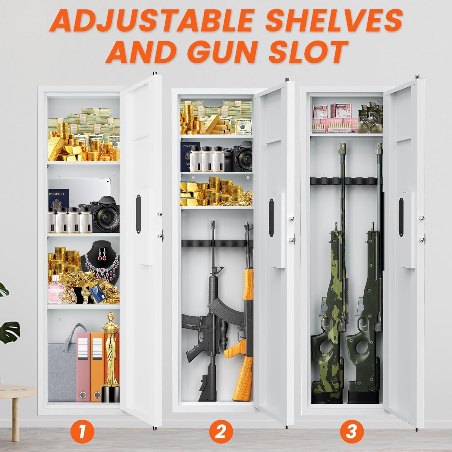 • 【Large and Multi-Functional Design】Our wall gun safe offers a generous storage space, accommodating not only firearms but also other valuables like jewelry, documents, and more. Its multi-functional interior layout allows you to customize the space to fit your specific needs. Plus, adjustable shelves and gun racks that can be adjusted in height make it perfect for storing guns with or without silencers or scopes.