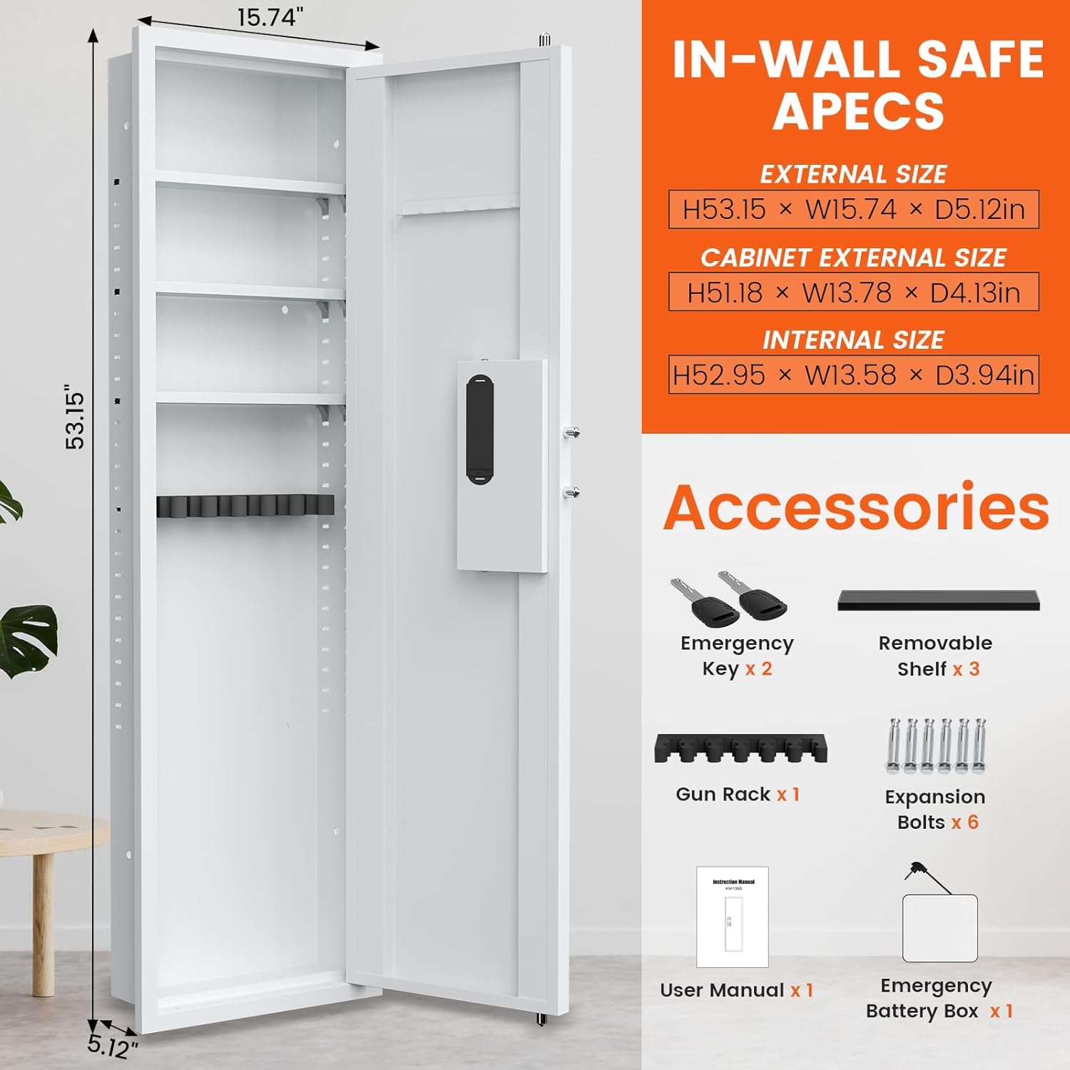 53" Tall Hidden Wall Safe with Fingerprint Lock - Fireproof & Waterproof, Dual Alarm System, 3 Adjustable Shelves, Magnetic Slot & Key Hooks - Modern White Steel Construction