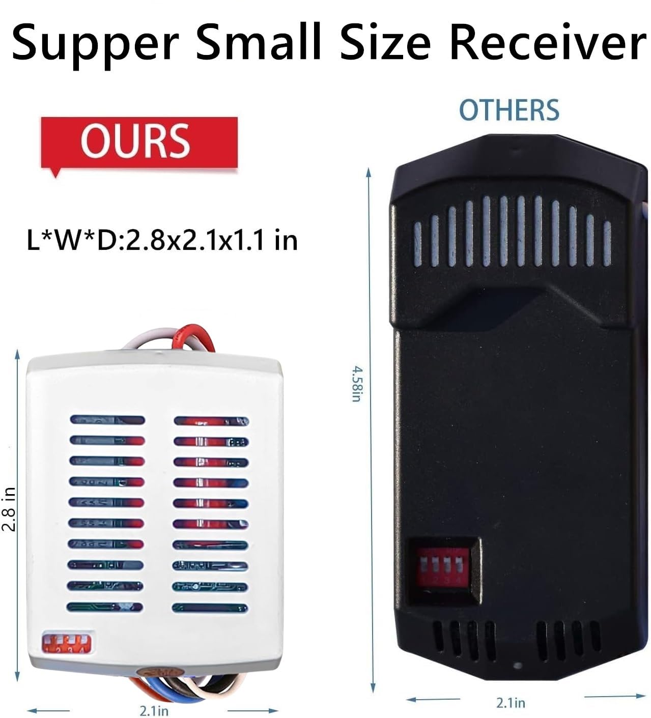 - Small Size Receiver & Full Range Dimmer: Super Small Size receiver(2.8x2.1x1.1in) can be installed into a small space of ceiling fan canopy. Light Dimming Capability, press and hold the light button and the lights will cycle through the dimming range,plus on/off switch ,turn on/off the main power.