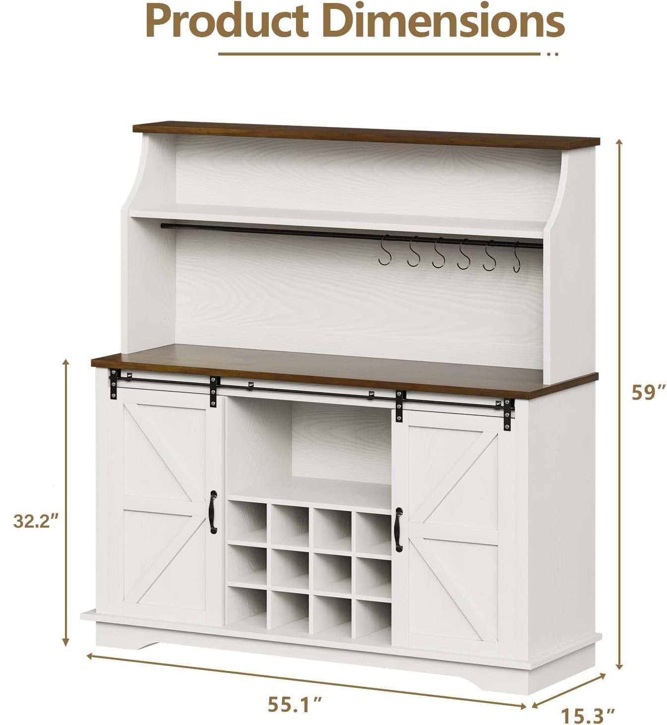 - Large Multiple Options Coffee Bar with Storage: Coffee hutch size: 55''L x 15.3''W x 59''H. The farmhouse coffee bar has 6 hooks, 12 wine racks, 3 glass holders, both open and closed storage space, and farmhouse coffee bar cabinet has adjustable shelves for different sized items.