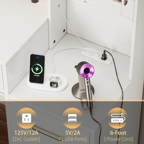 - 【Makeup Vanity with Charging Station】This modern vanity table features a built-in power strip with 2 USB ports and 2 AC outlets. No more anxiety about charging! It allows you to use your hair dryer or curling iron more conveniently while applying make-up, as well as charging your cell phone, tablet, or other electronic devices for taking selfies or live streaming more easily. Bringing you more convenience.