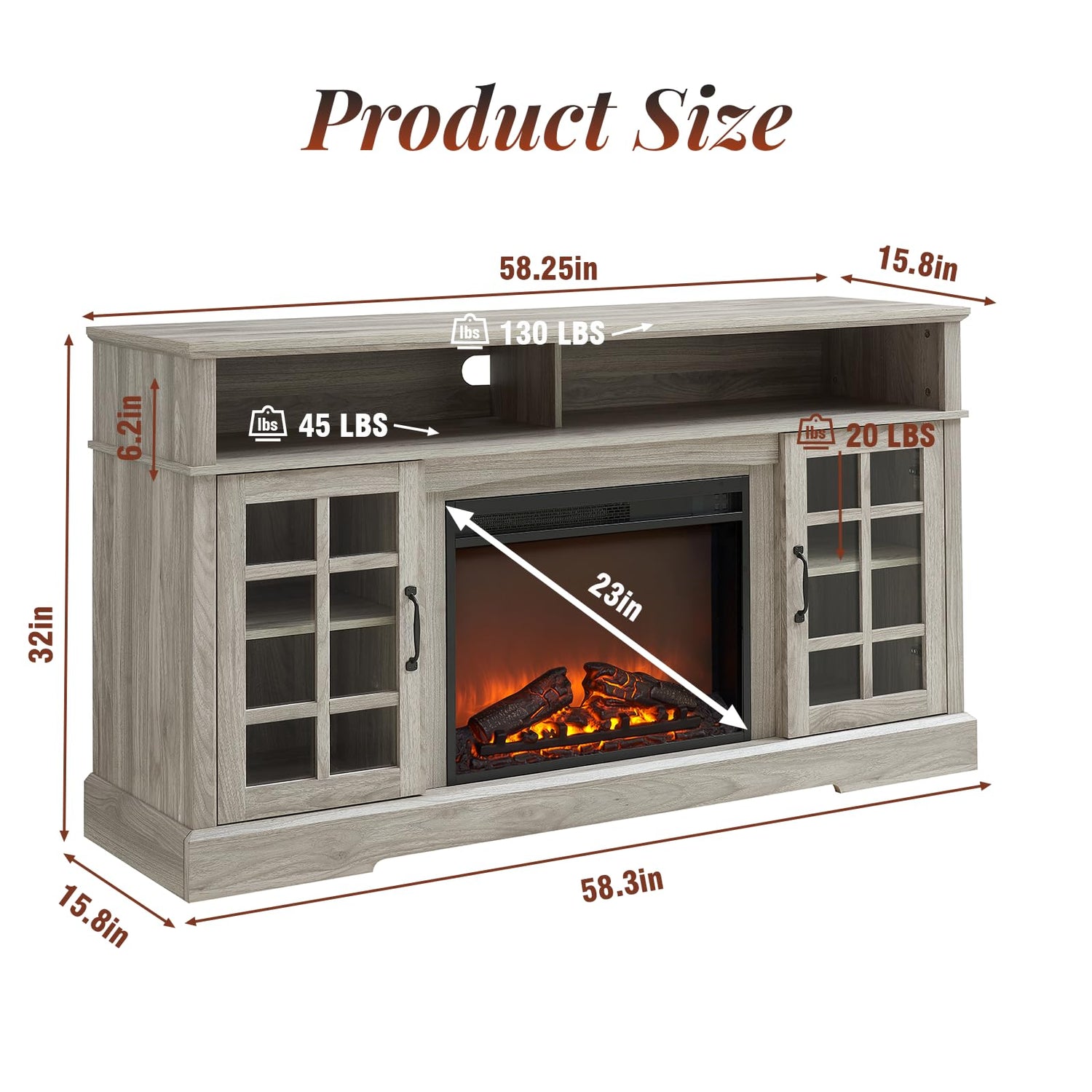 • 58" Classic Fireplace TV Stand: Fits TVs up to 65" with a 23" embedded fireplace, combining classic design with efficient heating to keep your room warmer in winter than smaller models. This console measures 58.3"L x 15.8"W x 32"H with a capacity of 130 lbs