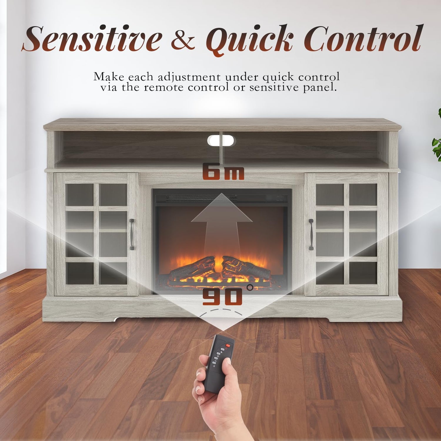 58'' Fireplace TV Stand for Television up to 65", Entertainment Center with Storage Cabinet and Shelves, 23'' Detachable Electric Fireplace with Remote&Adjustable Warmth for Living Room/Bedroom, Gray