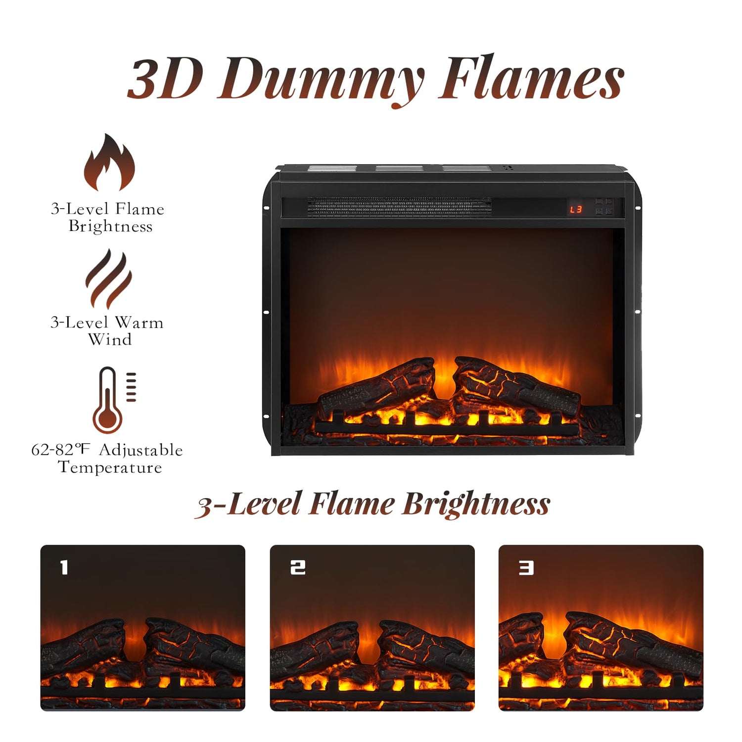 • Smart Fireplace with Faux Flames: Includes faux logs and flames with four brightness levels, adjustable temperature (62°F to 82°F), and customizable warm air speed. An 8-hour timer automatically shuts off, conserving energy. Overheat protection ensures safe use