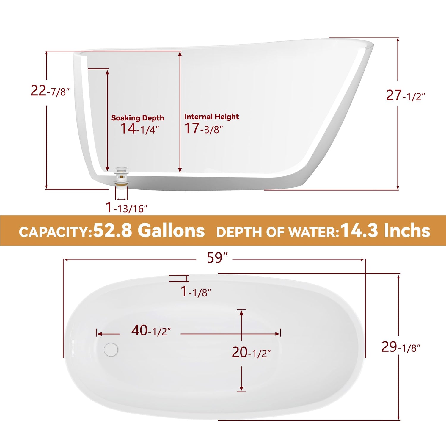 - ⭐【Tub Dimensions】:Length: 59 in; Width: 29 in; Height: 27 in. Capacity: 52.8 Gallons; Weight (empty): 81 Lbs. This bathtub is generally suitable for individuals with a height ranging from 5 feet (also suitable for those with a height of 5 feet or below) to 5 feet 9 inches, with a moderate weight. This is a general estimate, and the actual suitability may vary due to individual differences.