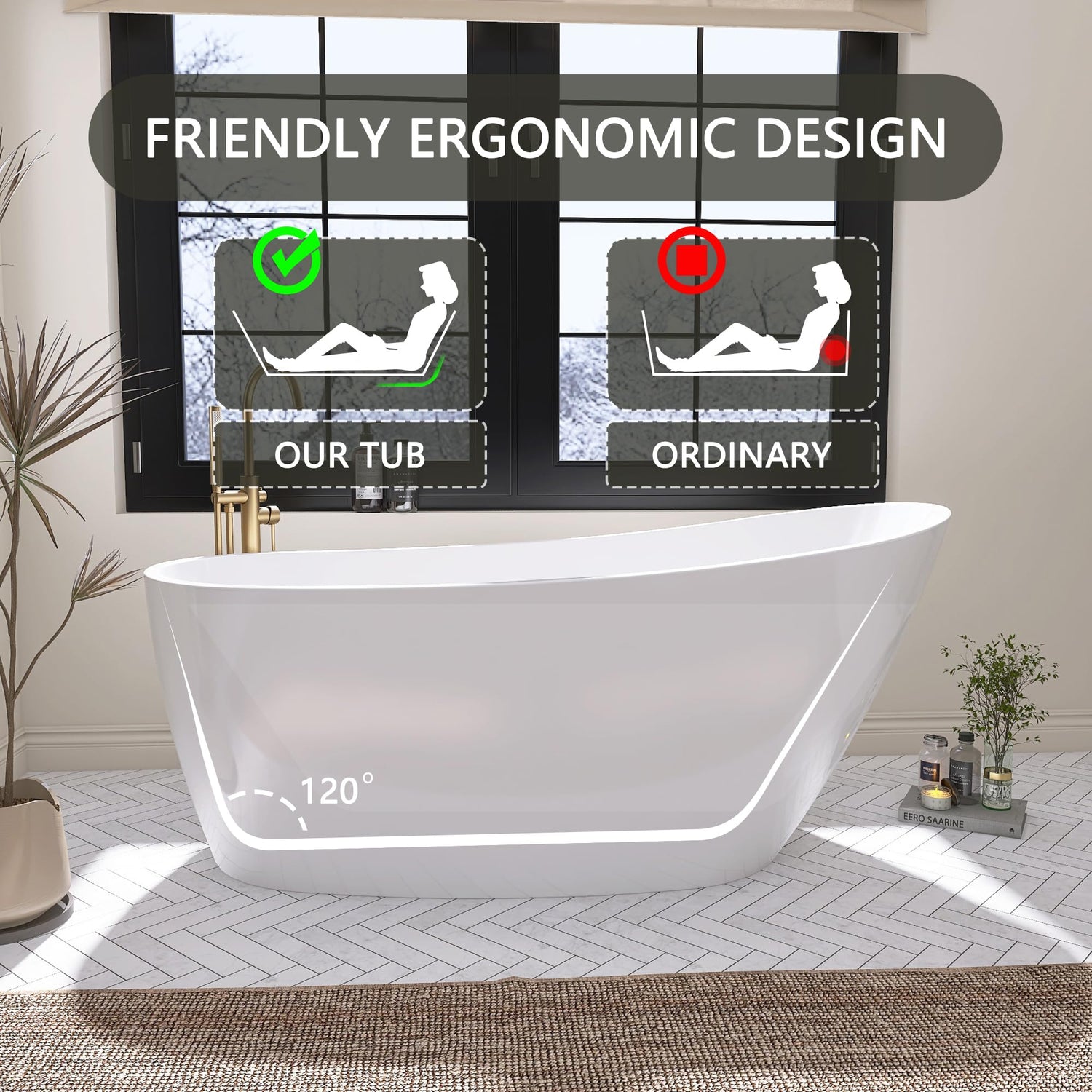 - ⭐【Comfortable Bathing Time】: Designed with a wide and deep tub sump, paired with a comfortable backrest, providing a relaxing bathing experience but less space occupation.Whether lie down or sit, it naturally conforms to the curves of your body . This bathtub is more conducive to the health of the cervical spine and can fully support the back and lumbar spine. And you can stretch your legs in the bathtub, so you won't feel tired after a long soak, good choice for private and commercial use.