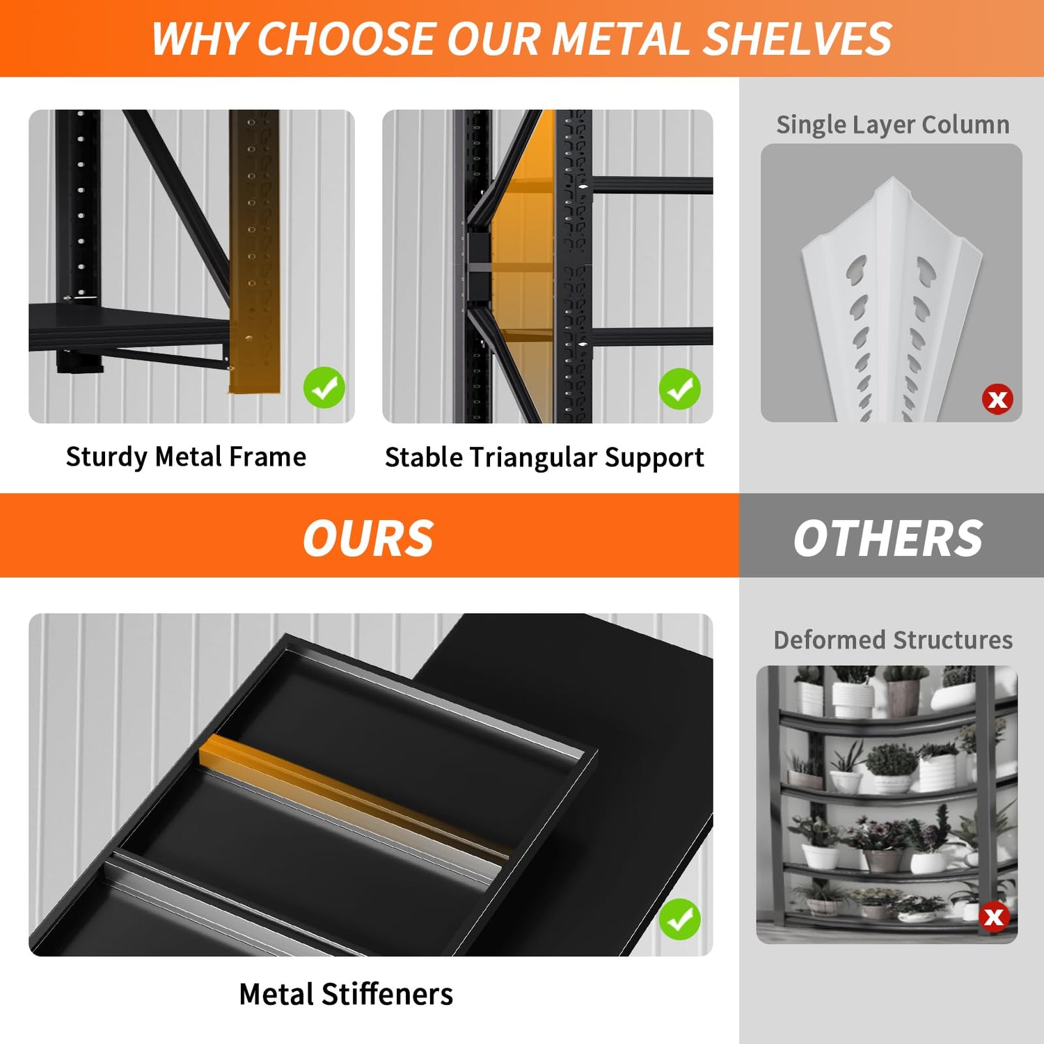 • 【4500LBS Capacity Heavy Duty Metal Garage Shelves】Constructed from high quality cold-rolled steel, the industrial shelving covered with rust-proof powder coated on all-metal surface, is more smooth and waterproof. Back of each level with extra multiple stiffeners can hold up to 1125 lbs, and a total load weight capacity is 4500 lbs. This ensures metal shelf organizer can withstand heavy loads without warping or shaking, are more sturdy and durable than other ordinary racks.