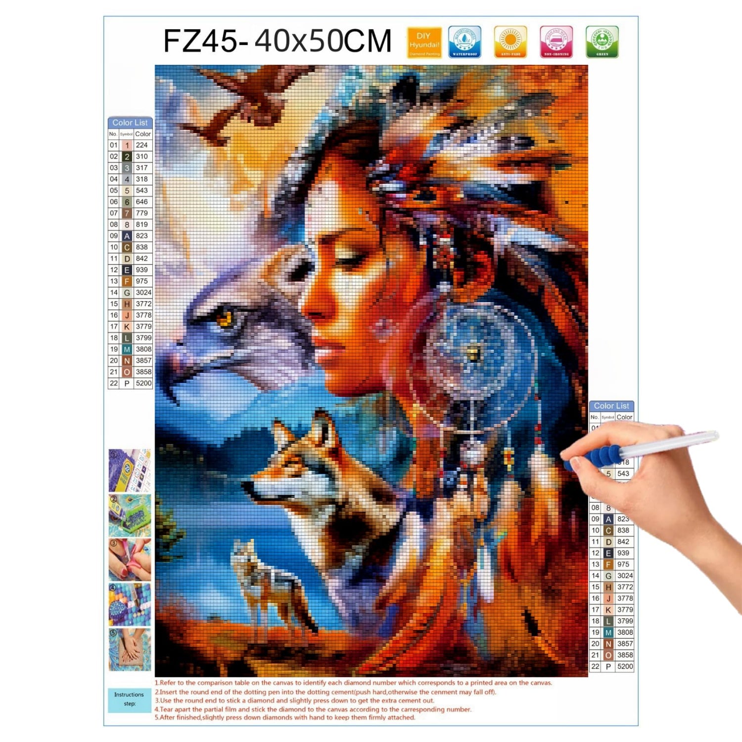 5D Diamond Art Painting American Native Indian Woman Mountain Fall Wolf Full Drill Diamond Art Painting by Number Kits for Adults Square Beads Mosaic Cross Stitch for Wall Decoration 16x20inch(3)