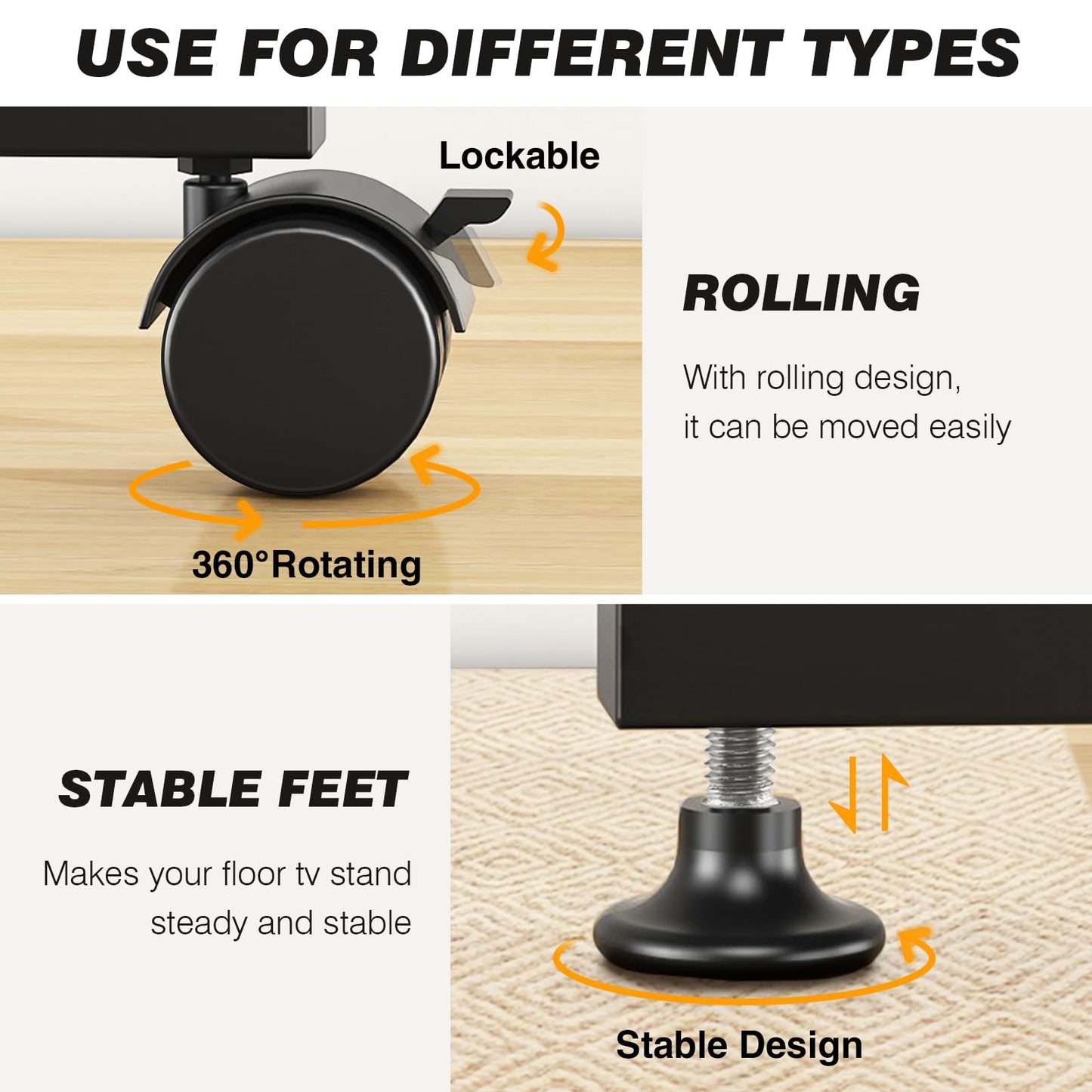 - 【Mobile TV Stand or Floor TV Stand: Free Choice to Move or Fix】: The mobile TV cart includes two types of feet. Flexible wheels move smoothly on the floor or carpet without scratching the floor and without noise. When you move the TV rolling cart around the house it doesn't interfere with your family's sleep. If you want to stabilize the TV cart, you can replace 4 adjustable height feet, which can keep the TV stands stable even if the carpet has a height difference.