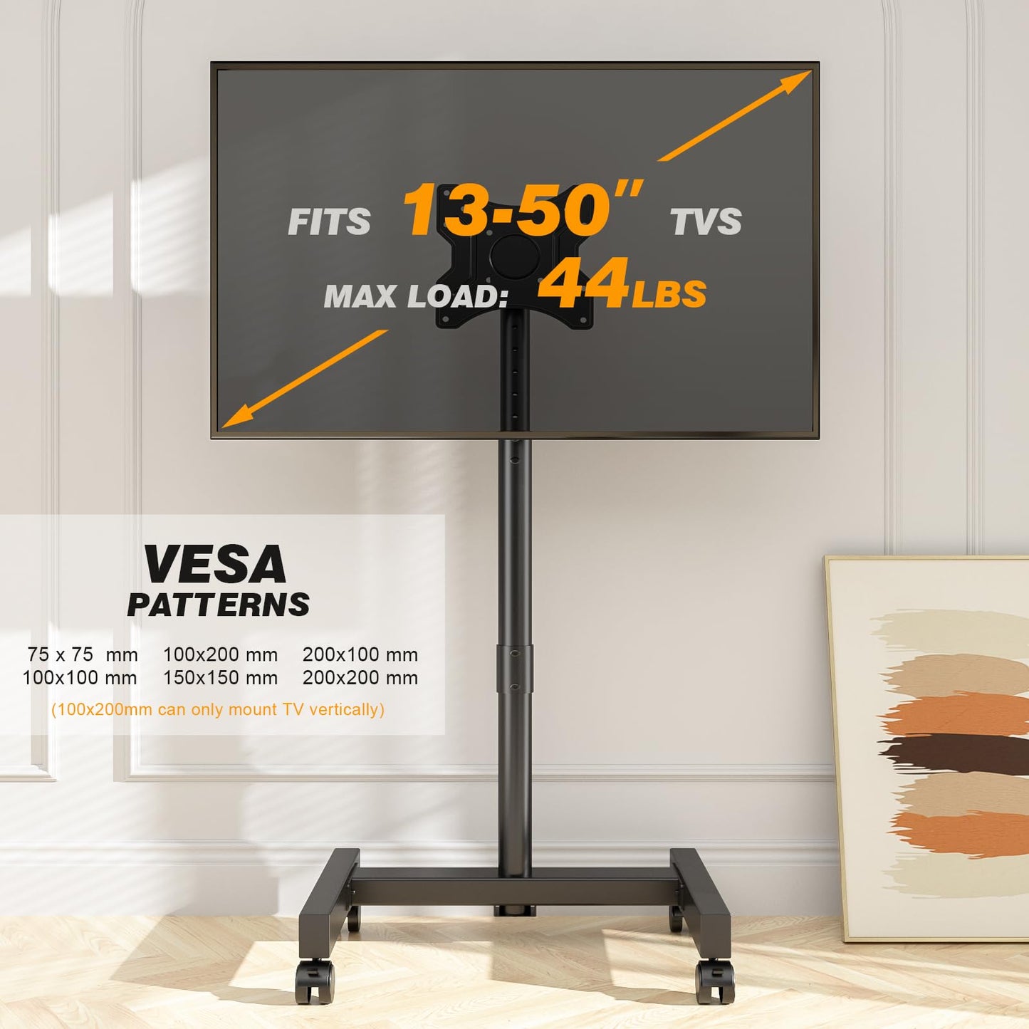 - 【Reinforced TV Mount: Keep Your Family Safe】: The mobile TV stand is made of alloy steel with a maximum weight capacity of 44 lbs to meet your needs for stability and security. The universal TV cart has safety lock designed to securely holding your TV in place to prevent it from falling. The sturdy metal TV stand comes with a 5-year manufacturer's warranty and friendly local service to help with any questions or concerns.