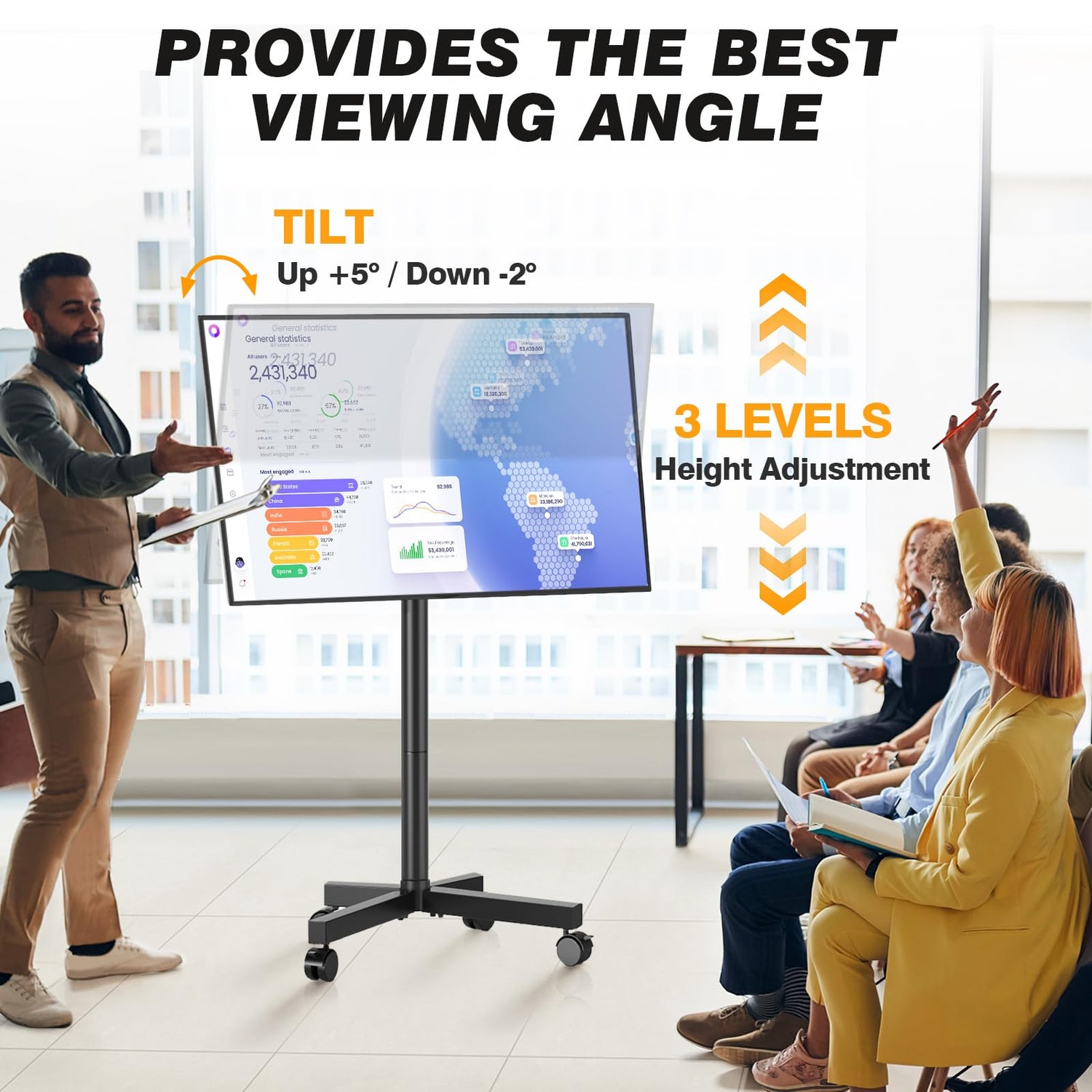 - Ideal Viewing Angle Experience - The mobile TV stand supports tilting from -2 ° to +5 ° to get an ideal view experience with different angles. This rolling TV stand has 3 levels height adjustment from 53 to 57 inches that meets the needs of different use in daily life. Both height adjustment and tilting takes pleasant view experience no matter family gatherings or meeting discussions.