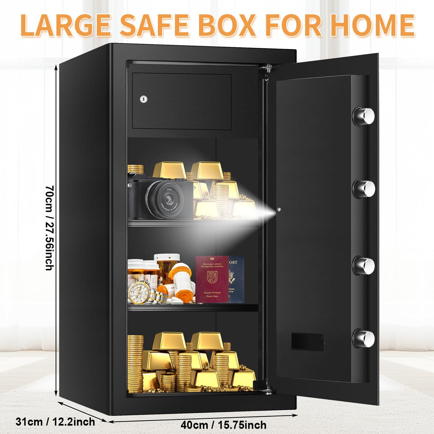 - SAFE BOX SMART CAPACITY: Exterior size: 15.75*12.2*27.56'', Interior size: 15*11.8*27''. The weight: 49.8 pounds. Perfect for storing handguns, thousands rounds of ammo and valuables. The large inner space with a removable shelf allows you to move up or down to accommodate different sized things you want to store. Perfect gift for homes, hotle, dorm and offices
