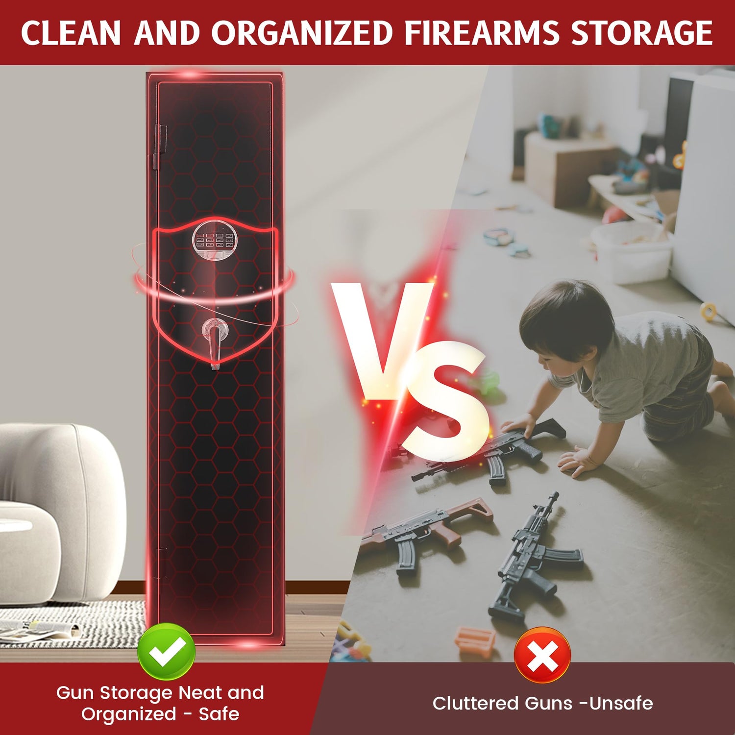 - 【ALARM AND SILENCE FUNCTION】This rifle safe has a sophisticated intelligent alarm system and a powerful silence mode. When the vibration alarm is activated, the gun locker will instantly activate, sounding an alarm when the safe is subjected to minor shaking, bumping or violent unlocking attempts. This acts as a powerful deterrent, effectively stopping any unauthorized or forced entry into the rifle safe stored in your home. If you prefer to err on the side of caution, simply switch the safe to silent mode. On this setting, the metal gun safe will open quietly without making any noise, ensuring your privacy and peace of mind.