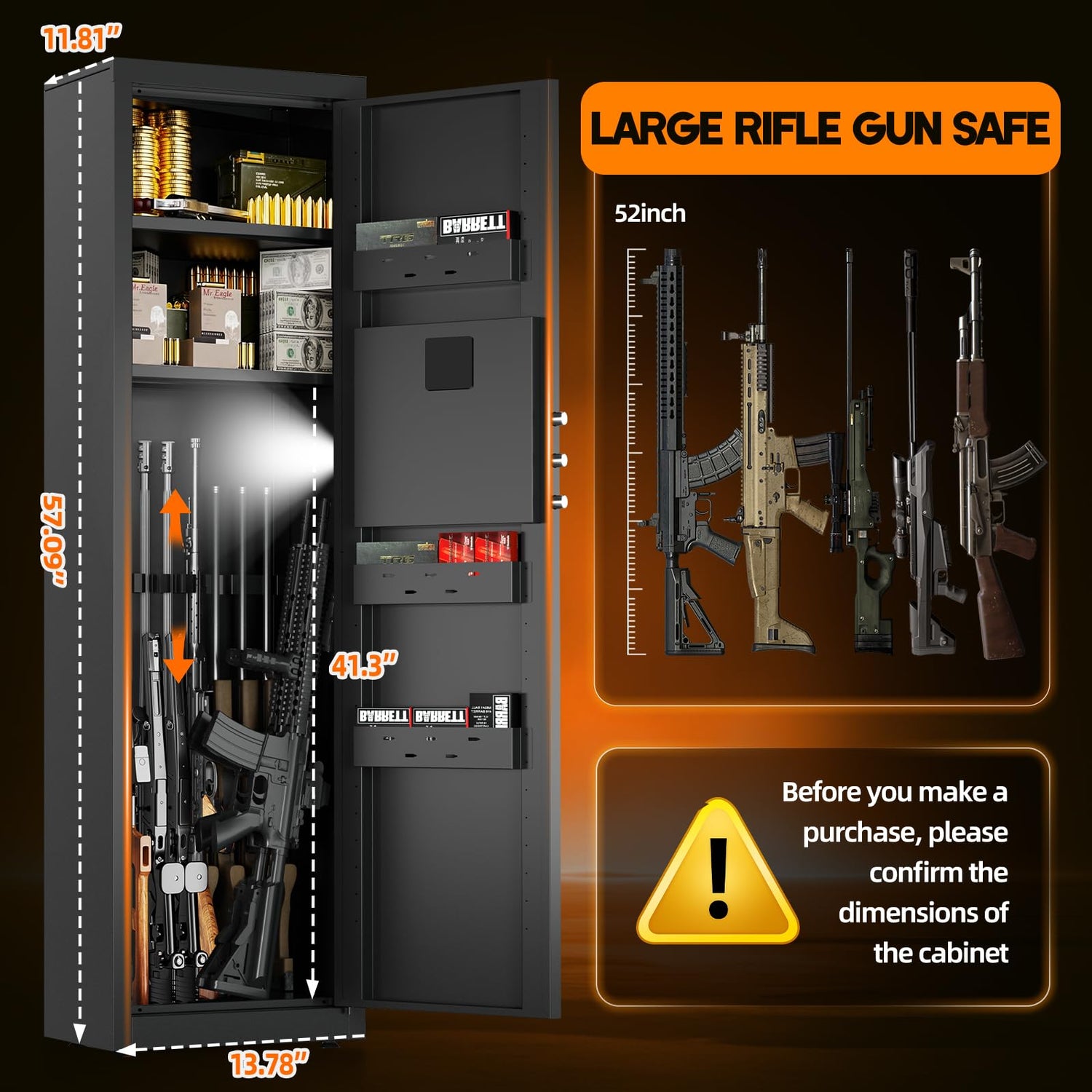- 【6-9 LARGE GUNS CAPACITY】The gun cabinet comes with adjustable gun shelves, which can be freely adjusted according to the length of the guns.The size of our multi-functional safe:57.09’’H*11.81’’W*13.78’’D,which can store 6-9 guns. It is really nice inside has a LED light. There are two pistol holder on the inside of the door and place for box of ammo.