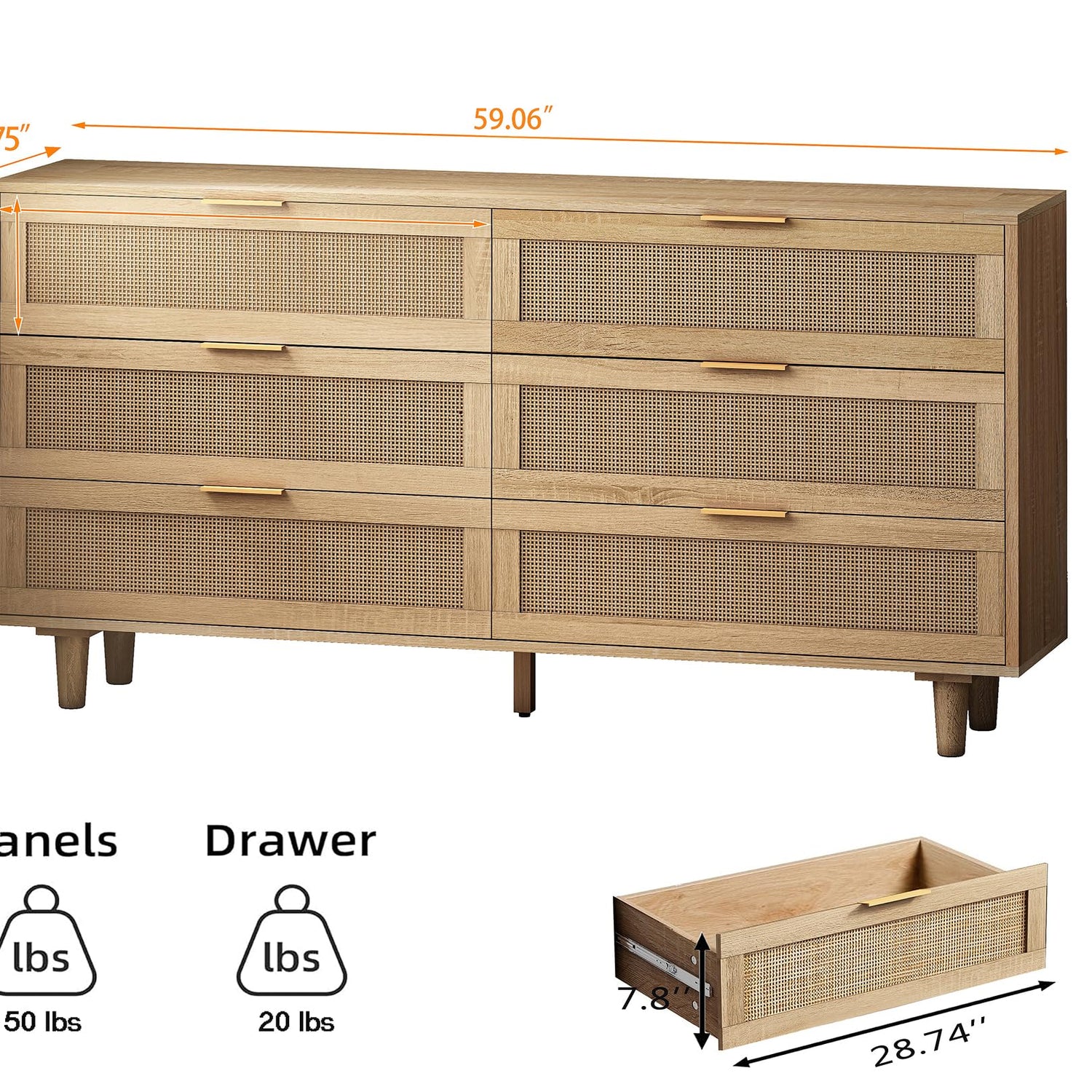 - 【PLENTY OF STORAGE SPACE】The overall dimensions of the rattan dresser are 15.75''D x 59.06''W x 29.53''H.Weighs 104.72 lbs. The smooth table top is the ideal place to place your favorite plants, pictures and decorations, and can hold up to 50 lbs. Comes with 6 deep drawers, each drawer measures 28.74"W x 7.8"H, each drawer holds up to 20 lbs. Can hold more clothes, makeup, socks, toiletries, books and other everyday items.Keep your belongings organized and keep your home tidy.