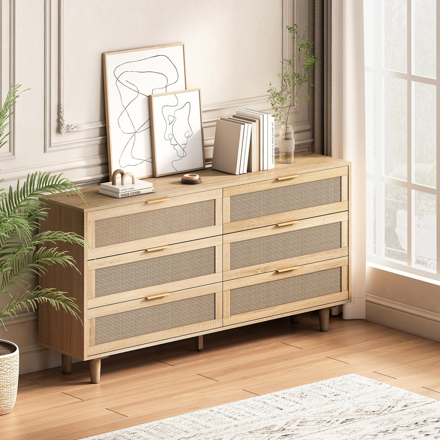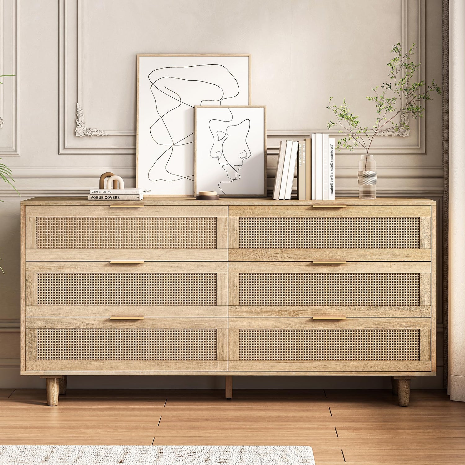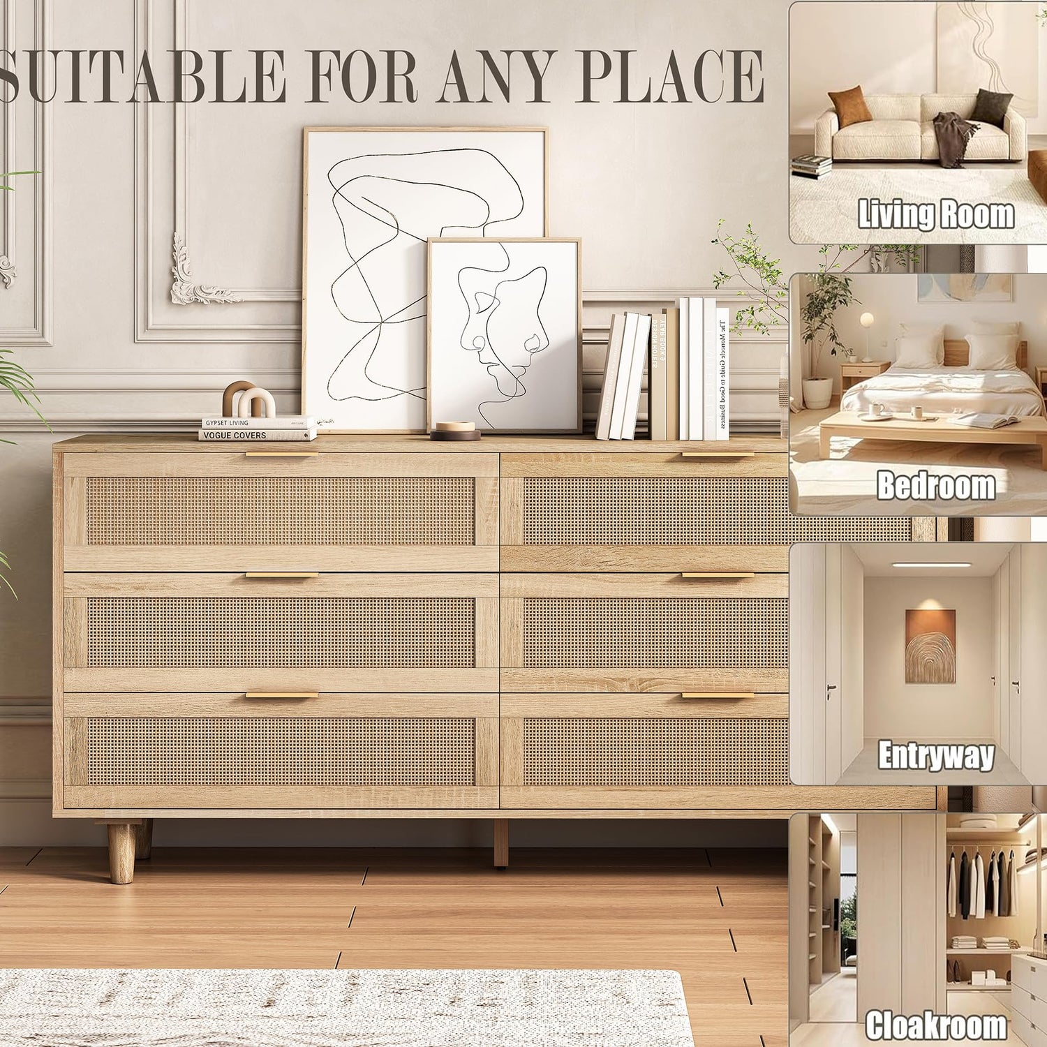 - 【HIGH-QUALITY MATERIAL,STURDY AND DURABLE】This 6-drawer dresser is made of high-quality particleboard, which is waterproof, scratch-proof, and wear-resistant. The drawer doors are made of natural rattan with smooth guide rails that can be pulled out and closed drawer very easily. The material is environmentally friendly, safe, non-toxic and harmless. The solid wood legs are strong and stable, have a durable structure, strong load-bearing capacity and are not easily deformed.
