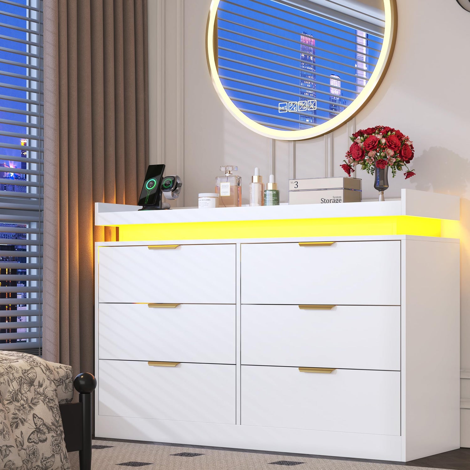 - 【White Dresser with LED Lights】This 6 drawer dresser is equipped with multi-color RGB LED light strips, colors and brightness can be freely adjusted through the button and App, creating a warm and stylish atmosphere in any space. Combined with the dresser's fashion design, creates a visually stunning floating effect at the top.