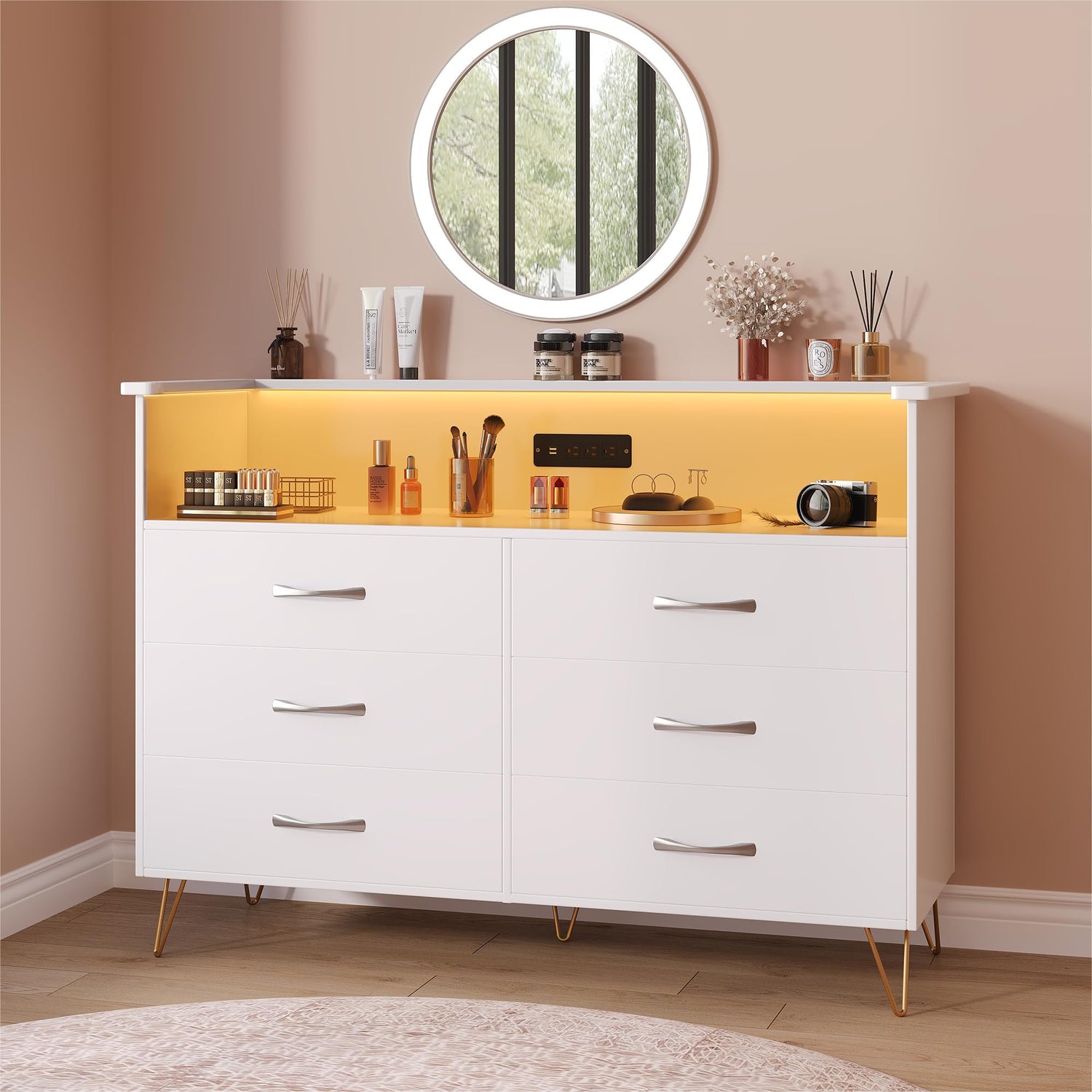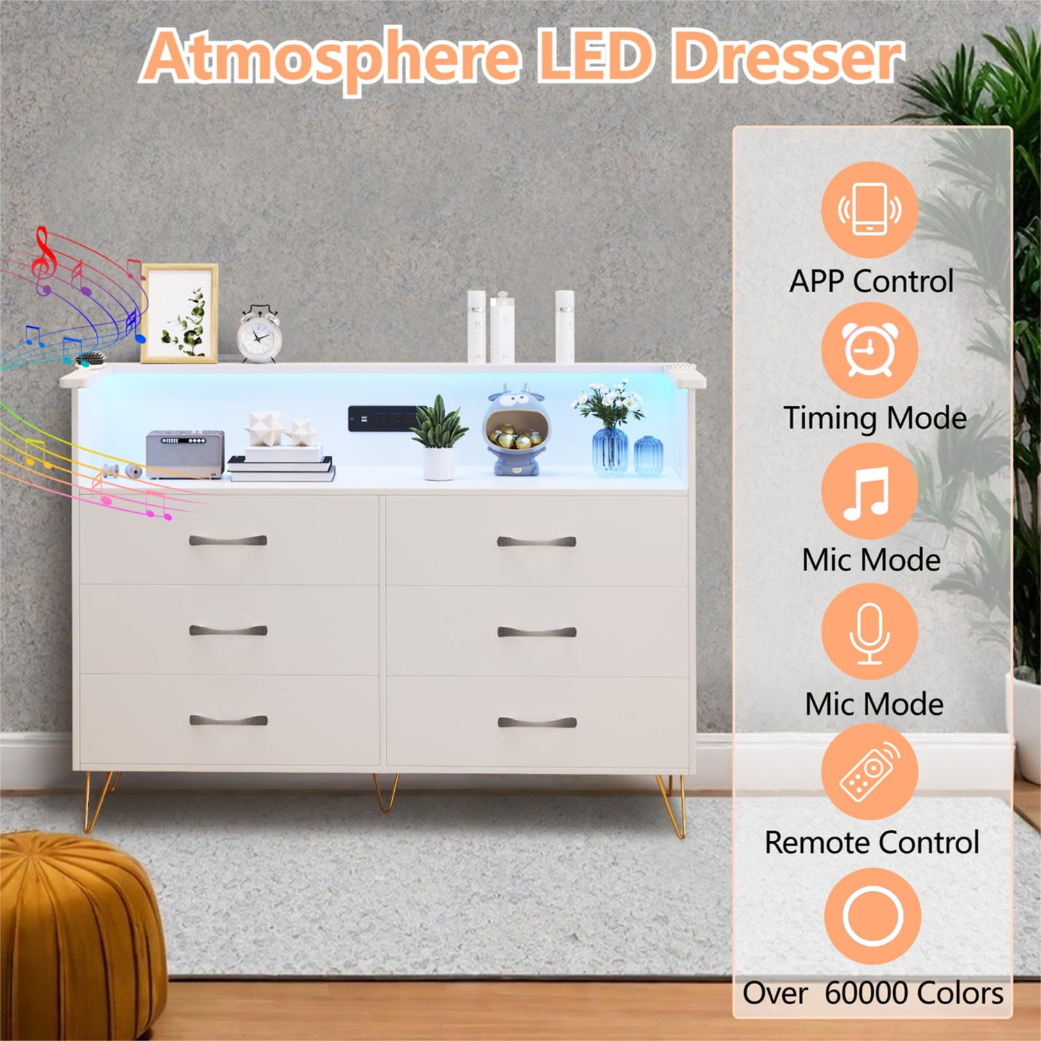 Details: Modern 6 Drawer Dresser, Wide Chest of Drawers with Charging Station & Led Lights, Large Storage Tower Clothes Organizer, Black Dresser for Bedroom
