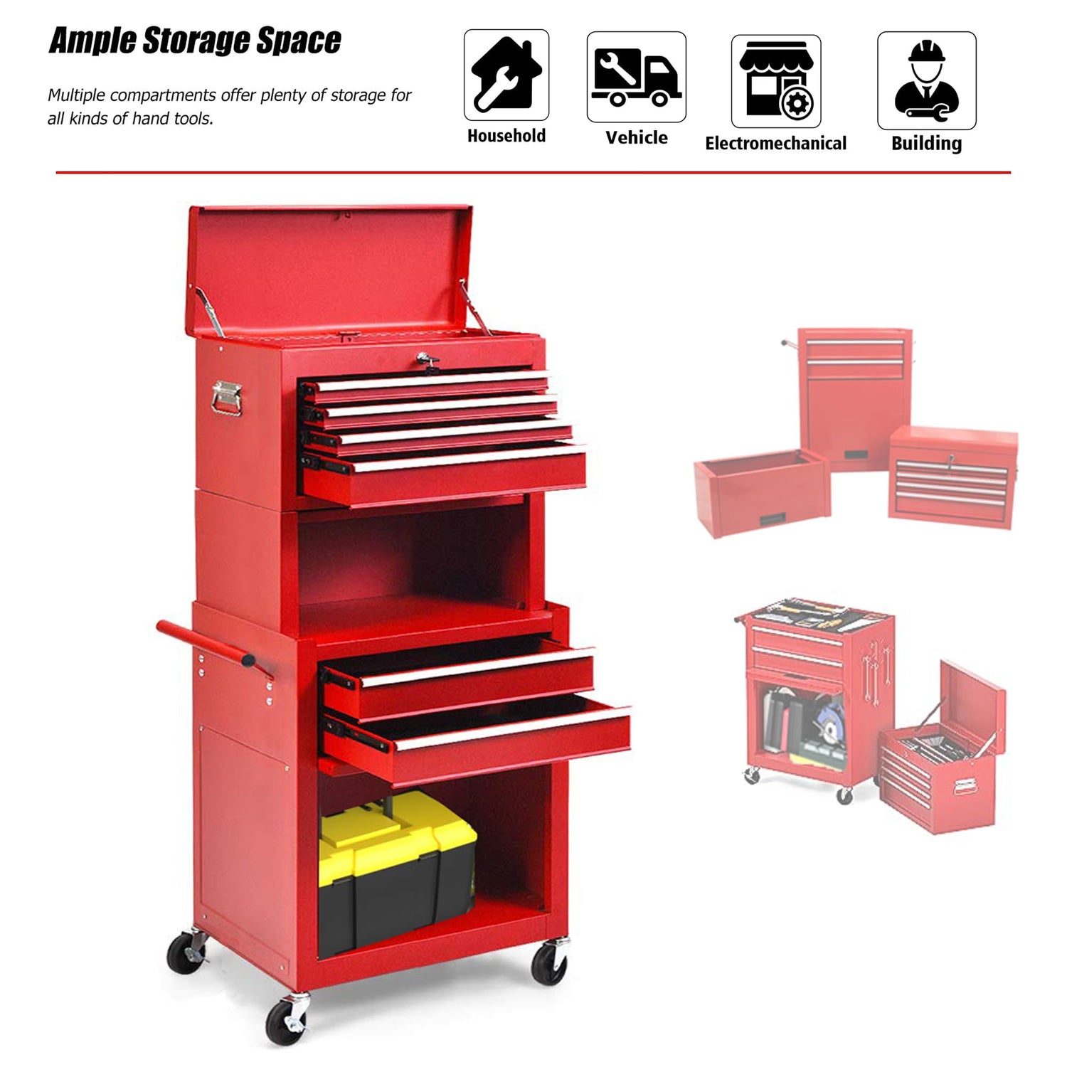 - 🔨LARGE CAPACITY:The toolbox is a 2-in-1 design, consisting of a removable top cabinet and a bottom cabinet. It can be separated or combined together according to different needs. And the toolbox has 6 drawers, which can be placed according to the size, material and role of the tools, more convenient to