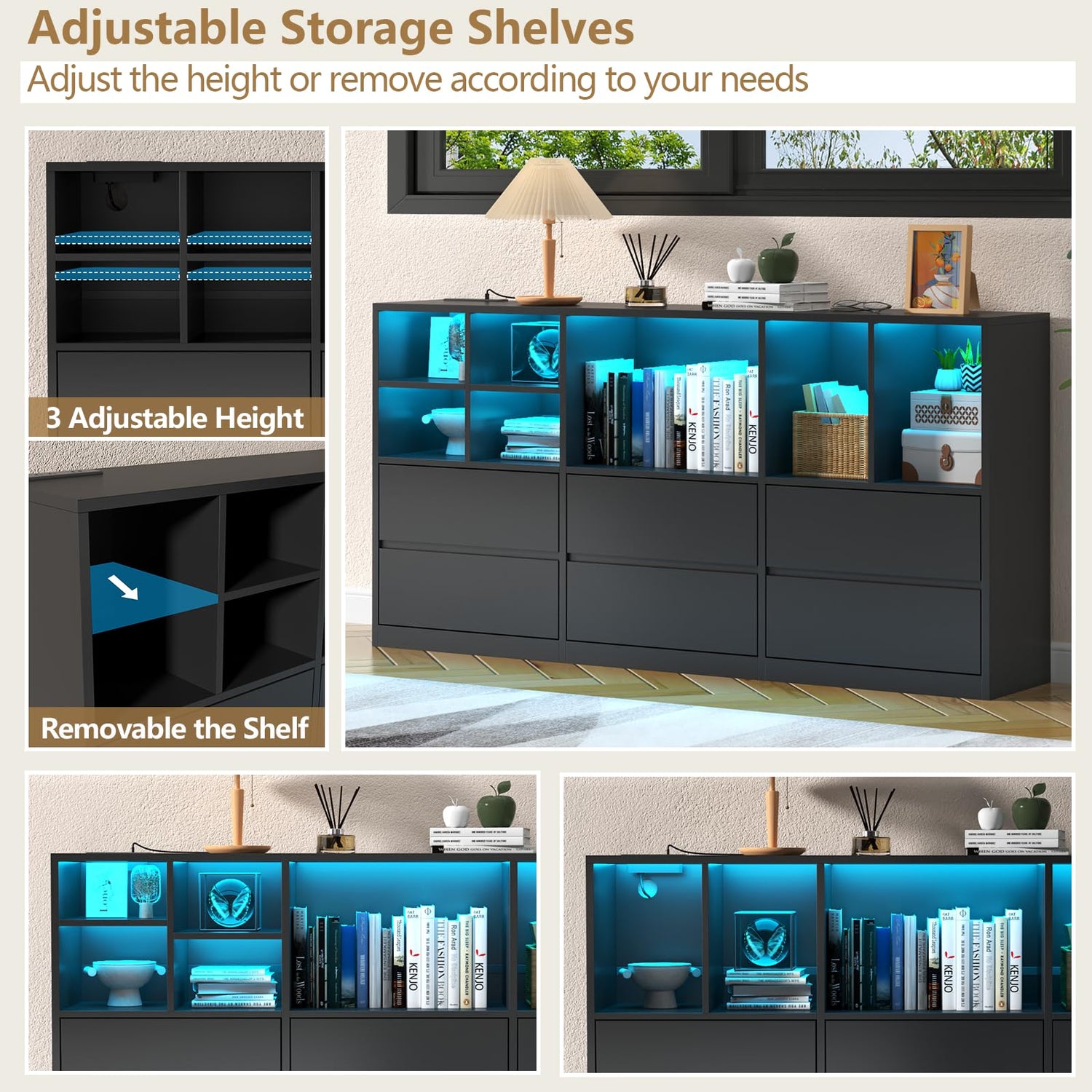 6 Drawers Dresser with 7 Storage Cubbies, LED Chest of Drawers with Power Outlet, 63" Triple Wide Long Dresser Organizer for Bedroom, Modern TV Stand with Open Shelf for Living Room, Entryway (Black)