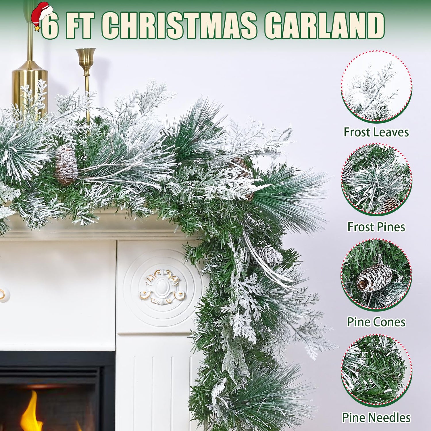 6 FT Christmas Garland with Lights, Artificial Flocked Pine Garland for Mantle, Lighted Garland Real Touch Norfolk Pine with Frost Leaves Pinecones for Indoor Outdoor Christmas Decorations