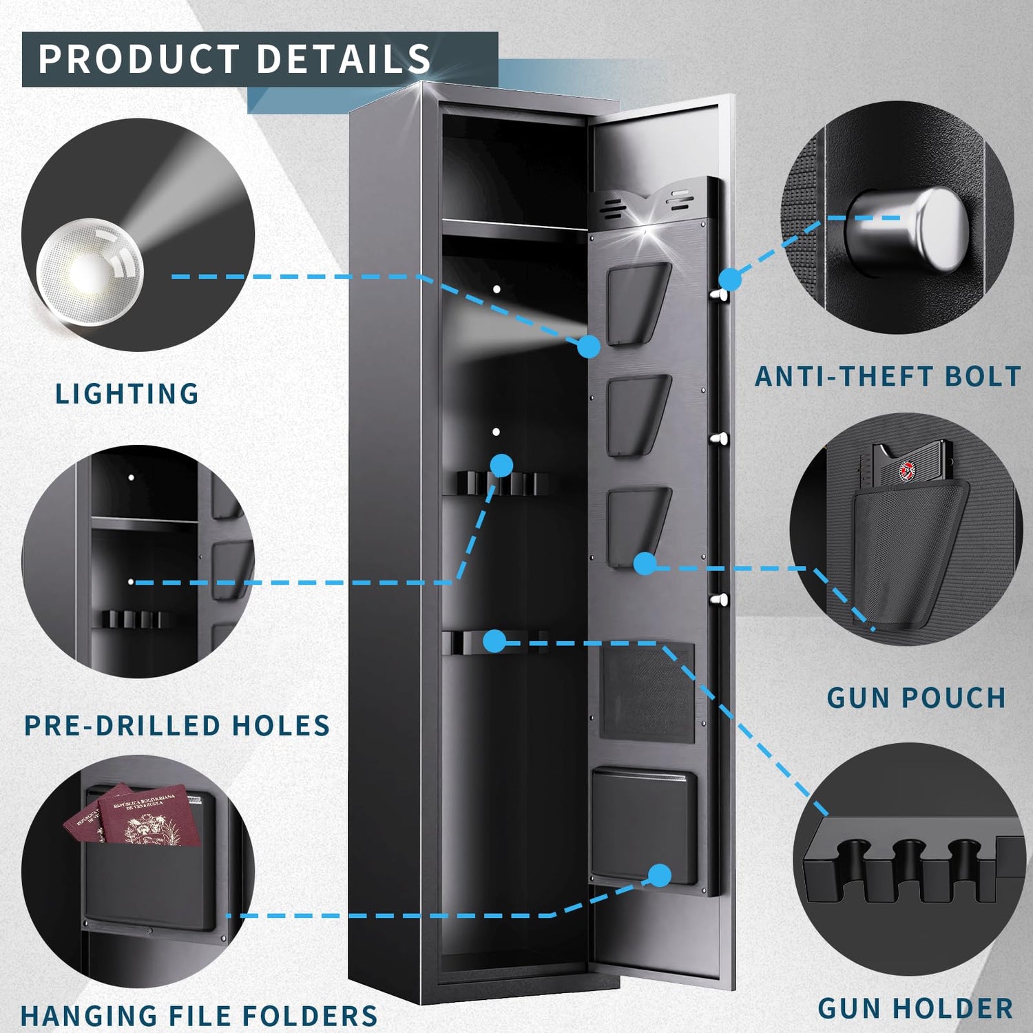 - Organized Storage Solutions: With dimensions of 11.8"W * 13.7"D * 57"H, this large-capacity rifle safe accommodates various firearms, including handguns and long guns. Featuring a detachable two-layer shelf and a thoughtfully organized door with 3 pistol pouches, 2 document pockets, and a bullet box, this gun cabinet offers unparalleled organization for all your gun storage needs