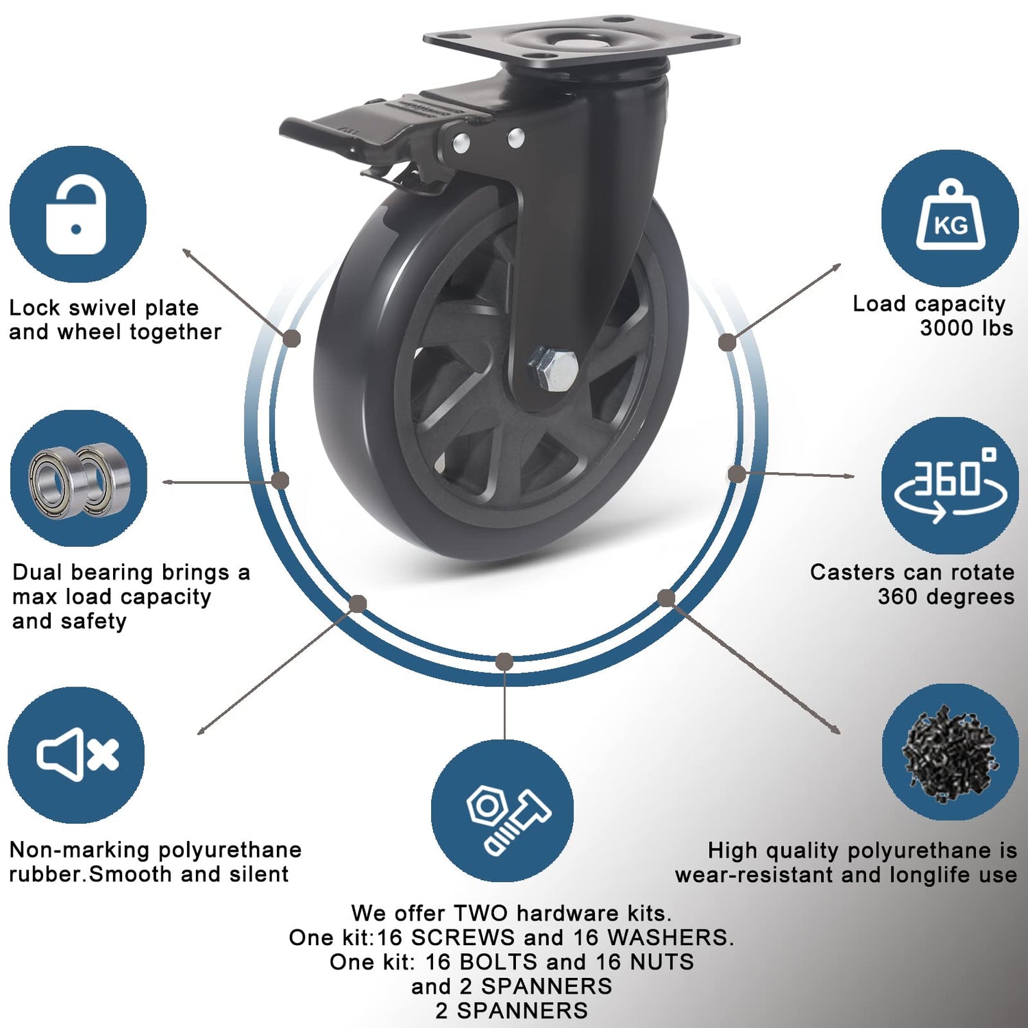 6 Inch Caster Wheels 3000lbs,Heavy Duty Casters Set of 4 with Brake, No Noise Polyurethane Swivel Caster Wheels for Cart,Furniture,Workbench(Free Screws & Spanners)