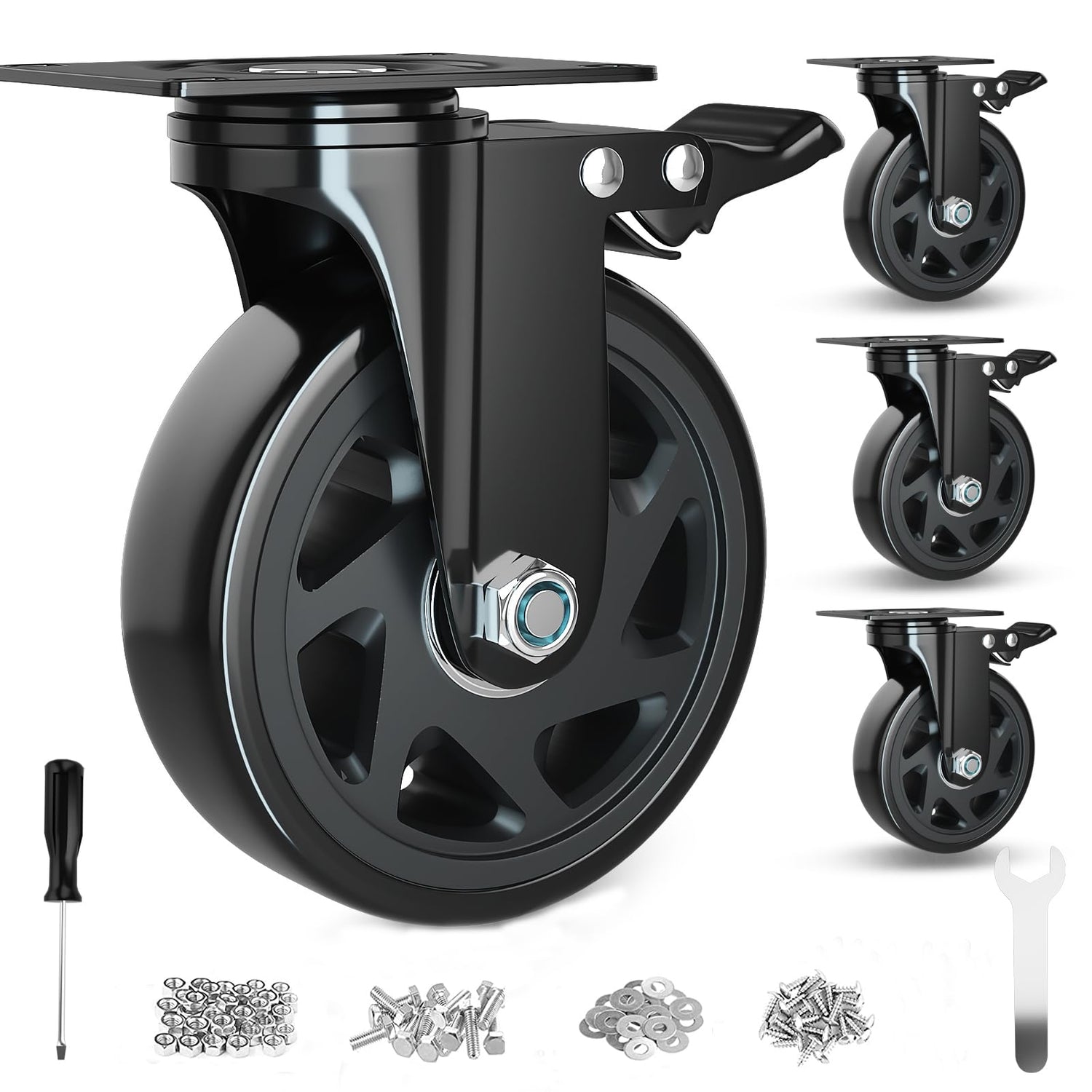- EASY INSTALLATION & WIDE APPLICATION: Each package of caster wheels is included 4 swivel casters with brakes, two hardware kits: 16 x Pointed Screws (with 16 Washers) plus 1 x screwdriver, 16 x Flat hex bolts (with 16 Nuts) plus 1 x spanner, which are suitable for two different ways installation. You can easily install the wheels for cart, DIY caster wheels for furniture, workbench, trolley, cabinets, add furniture casters for easy moving.
