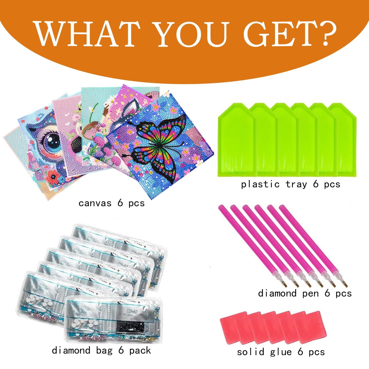 - 【Diamond Art Kits for Kids 6 Pack】Each creative kids diamond art kits comes with all tools in need. Following tools are Included: 6*HD painting canvas, 6*diamond pen, 6*cube diamond tray, 6*red glue clay (2cm *2cm), and enough colorful round diamonds. For each diamond dots for kids we'll provide 20% diamond more than need.(Note: This diamond art for kids does not include frame)