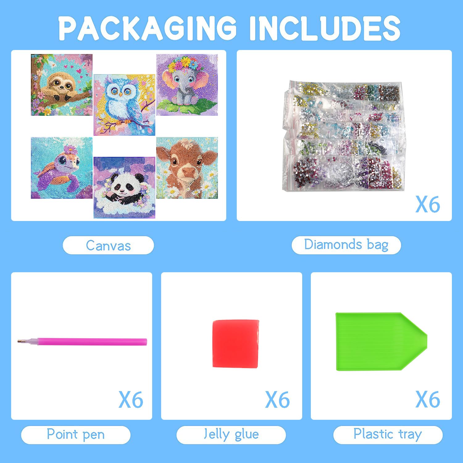 - ❤【Contain All Tools】Diamond art kits contain all tools: Advanced full drill adhesive canvas,premium full-drill adhesive canvas with printed Letter and Number Symbols,6 high-definition environment-friendly canvases,enough round diamond drills in OPP packaging,6 diamond pens,6 adhesive,6 trays for holding diamonds.We add 30% diamonds to each package to ensure there are enough diamonds to complete the diamond painting,so you don’t need to purchase any additional tools.(Without Frame)