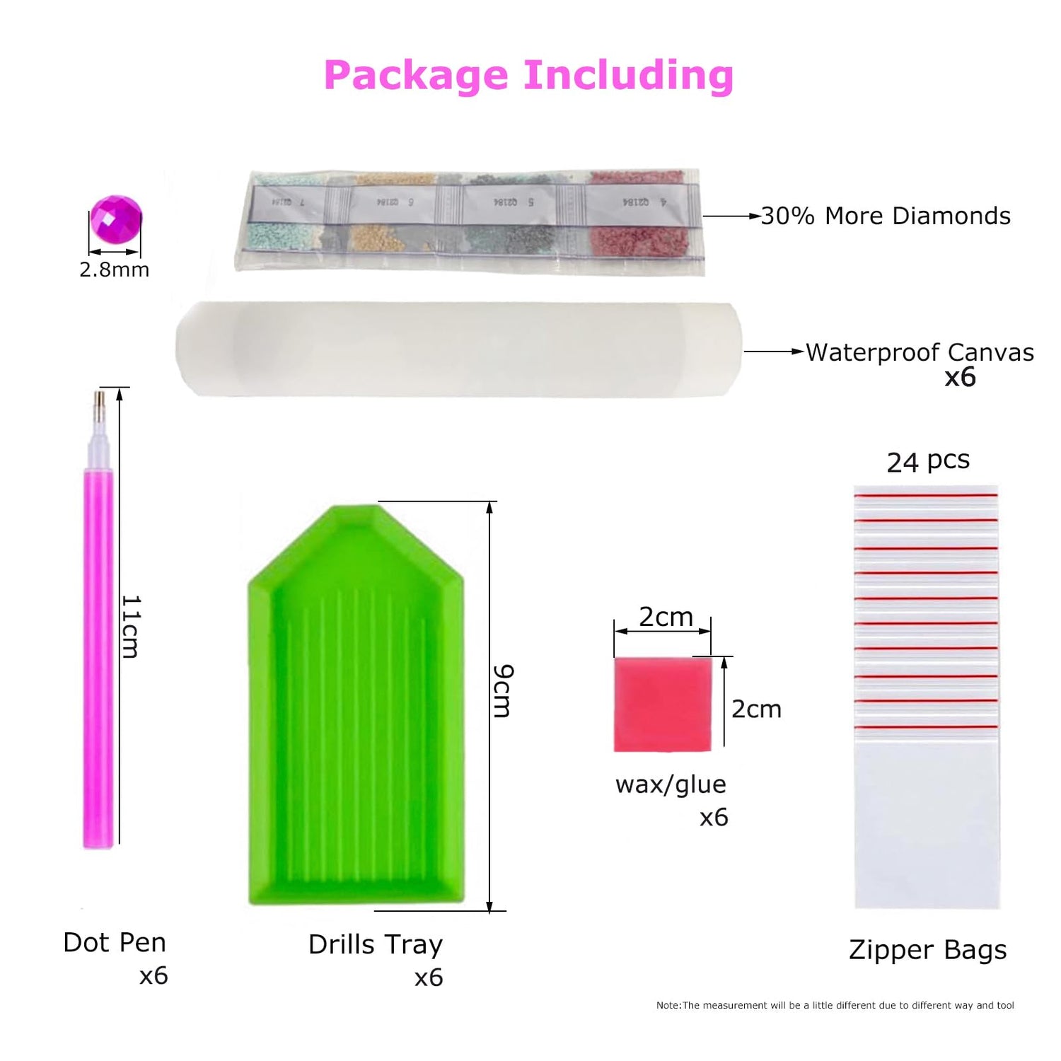 - 6 Pack Diamond Art Painting Kits for Adults Include : The 6 pack diamond paintings kits for adults canvas size is12x16In (30x40cm) large enough to show picture details. The glitter diamonds in this multi-pack diamond painting are consistent in size and shape.The diamonds color will never fade. Finished diamond art painting more brilliant and vivid. The diamond dot kits 6 pack include pre-printed canvasx6, diamond dot penx6, wax /gluex6, trayx6, zipper bagsx60, anti-slip cap for drill penx6 and color coded diamondsxmany . Kindly note, frame not inclueded