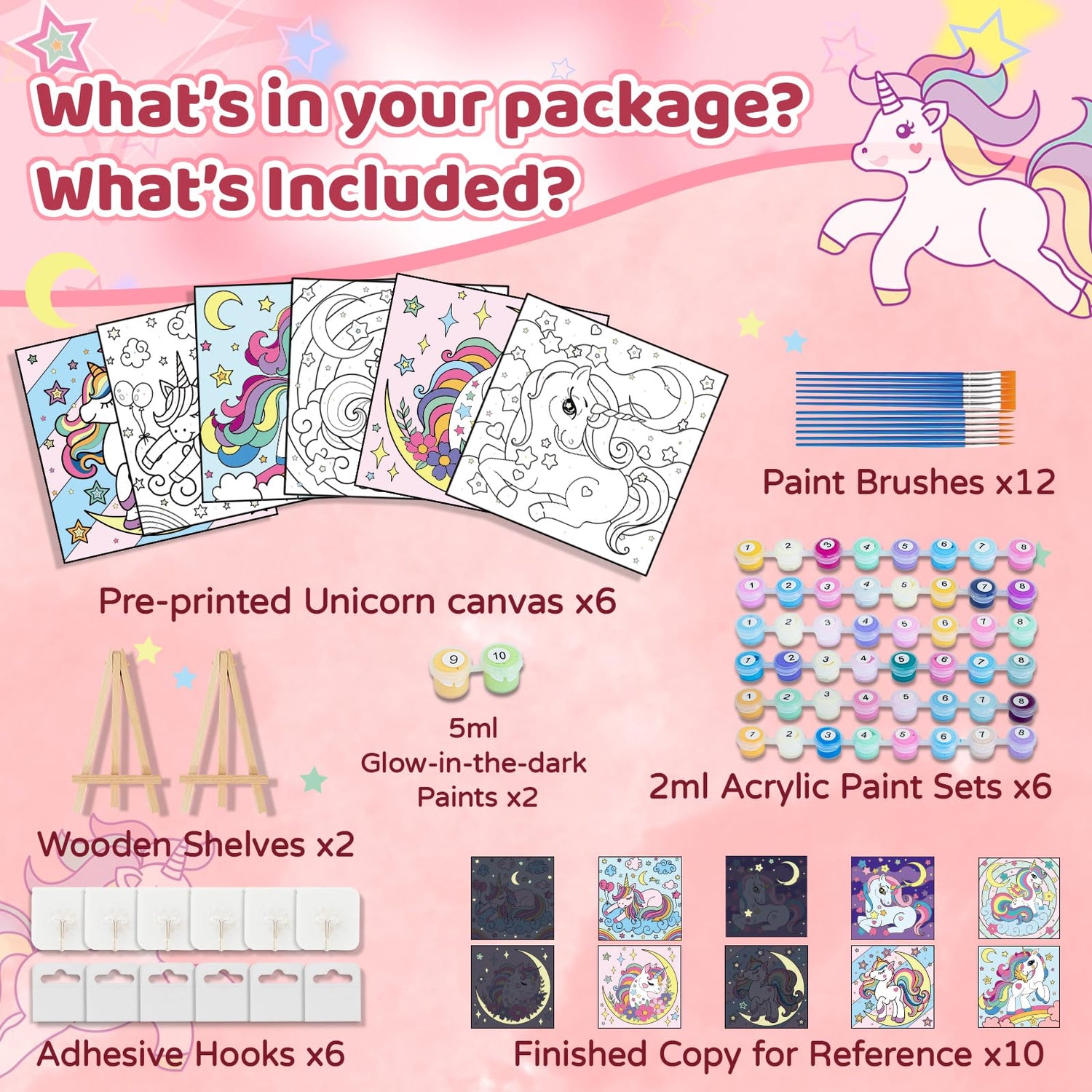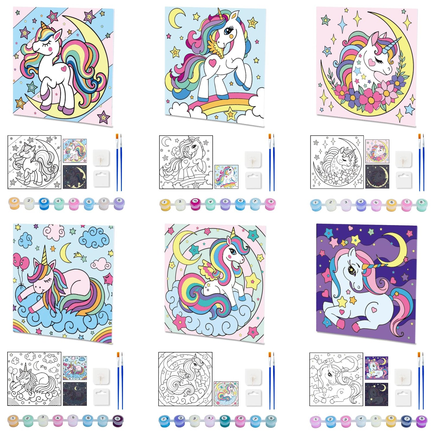 - All-inclusive Unicorn Paint by Numbers Kit :To create authentic works of art, includes 6 canvas (7.87” x 7.87”), 48 acrylic paints, 2 glow-in-the-dark paints, 12 brushes (Different Nibs), 2 wooden easels, 6 adhesive hooks,6 Hangers, 12 guide cards of the final image (Day and Night). Let your child's creativity flourish as they indulge in a seamless crafting experience, painting exquisite unicorn artworks