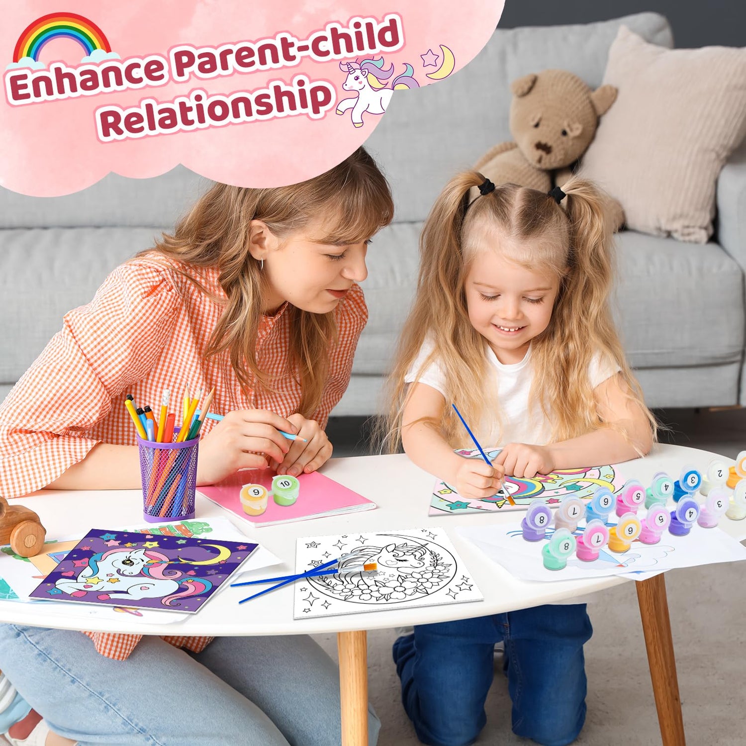- Unique Unicorn Home Room Decor: This set consists of 6 canvases, providing hours of entertainment. It allows up to 6 kids to paint simultaneously. 2 wood easels and 6 Hooks included can display the finished artwork. Your child will feel a great sense of pride seeing their work showcased in various rooms like the living room, bedroom, kitchen, or wherever you desire to match different decoration styles. Moreover, it is perfect for sharing with siblings, cousins, friends, and even parents