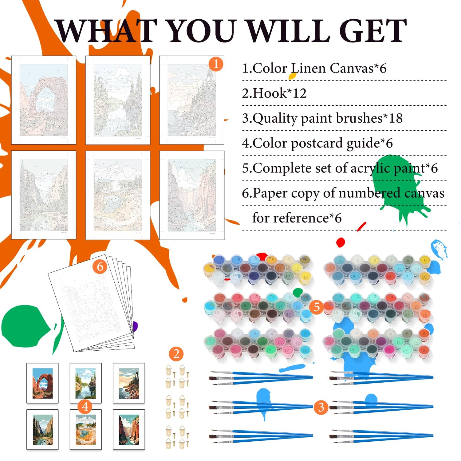 - What You Will Get: Acrylic DIY 6 pack paint by number has a complete tool kit, including 18*nylon brushes, 12*hook nails, 6*matched Acrylic paint and 6*HD Canvas, 6*paper copy of numbered canvas for reference, 6*color reference guide. Open the package and you can start painting immediately