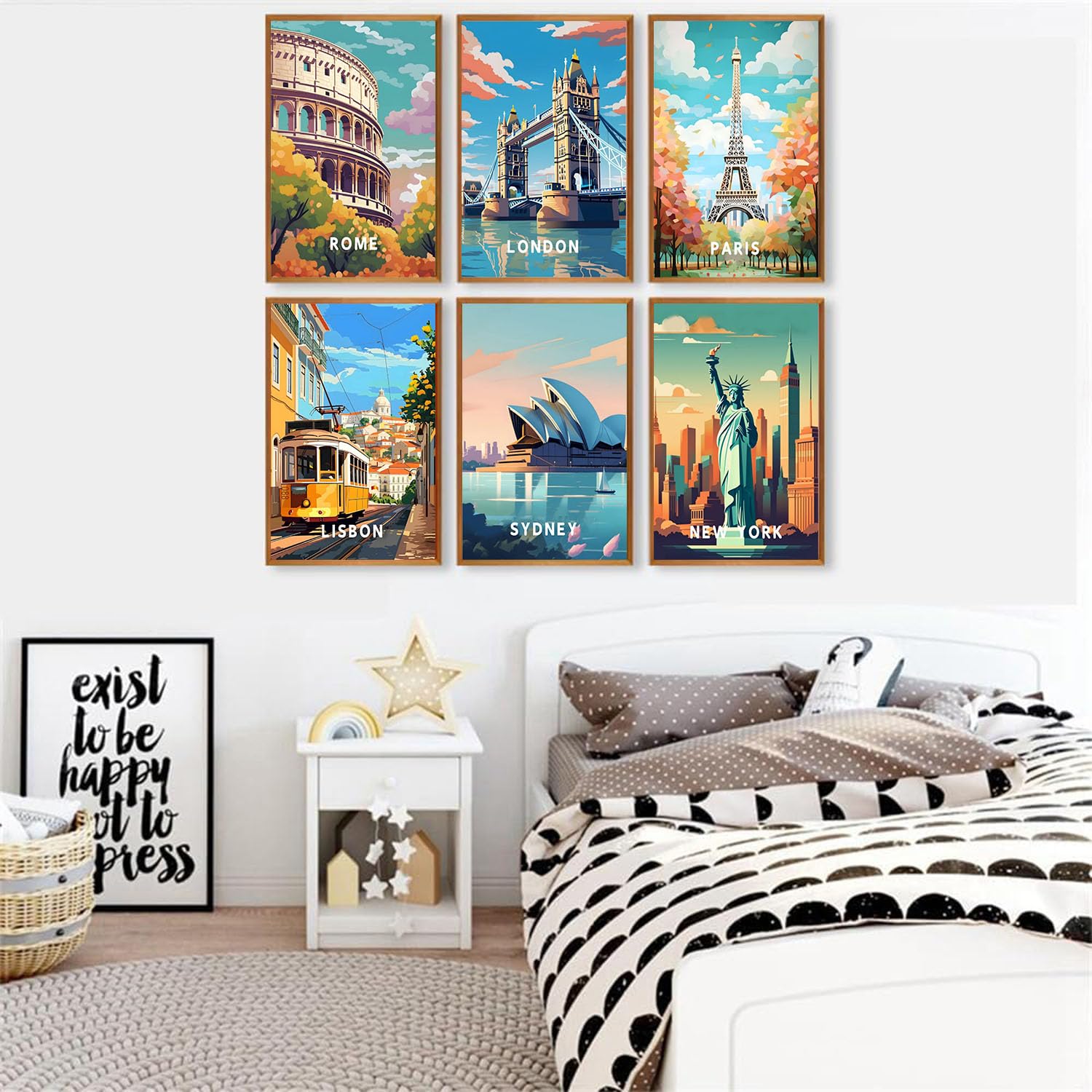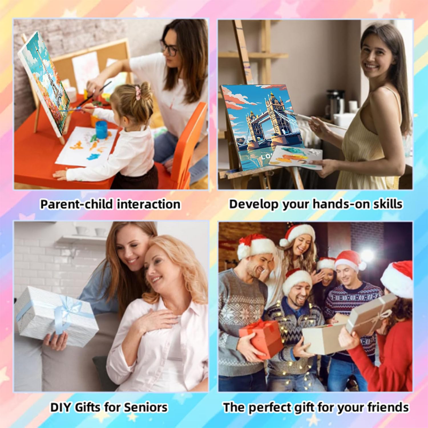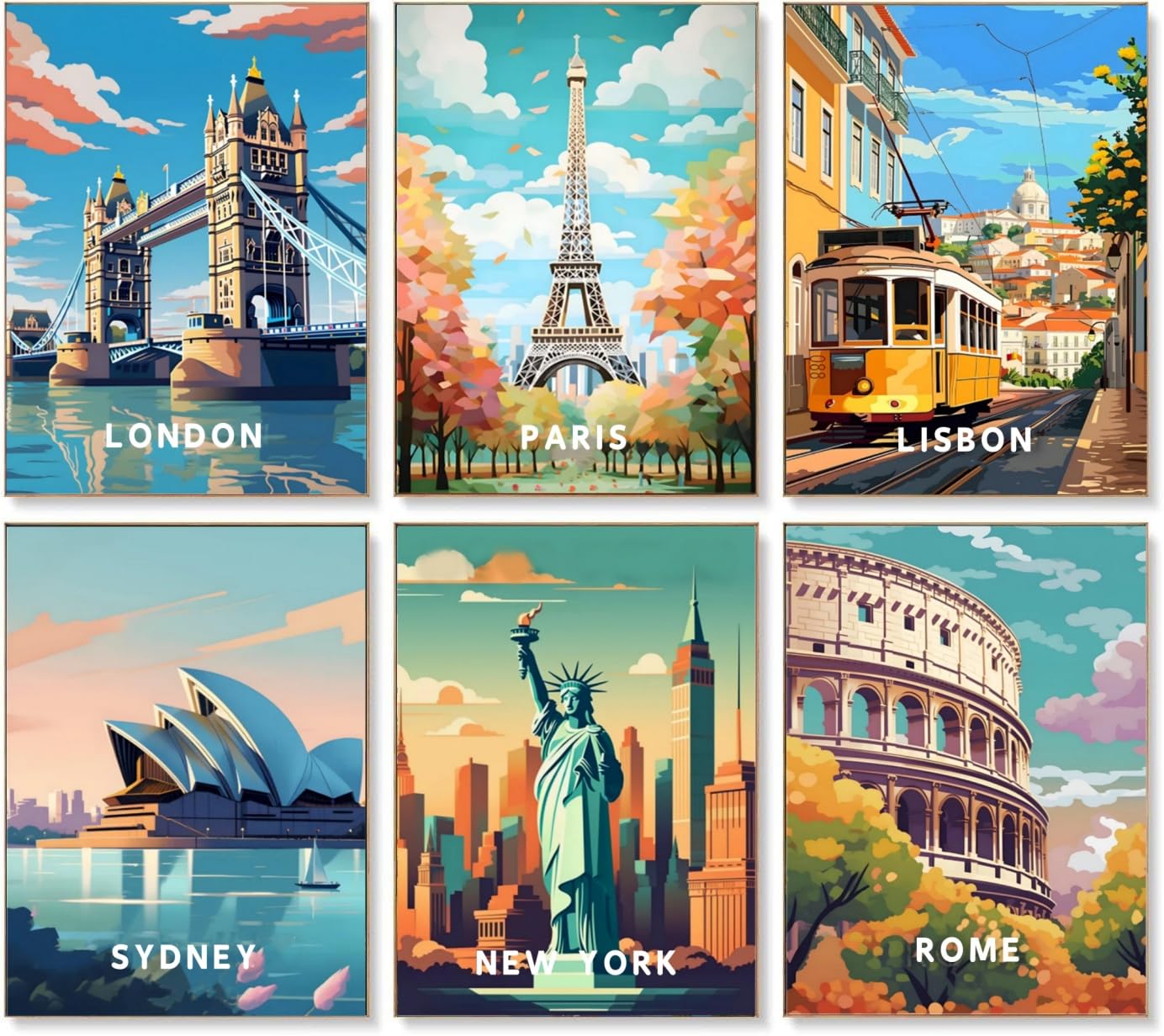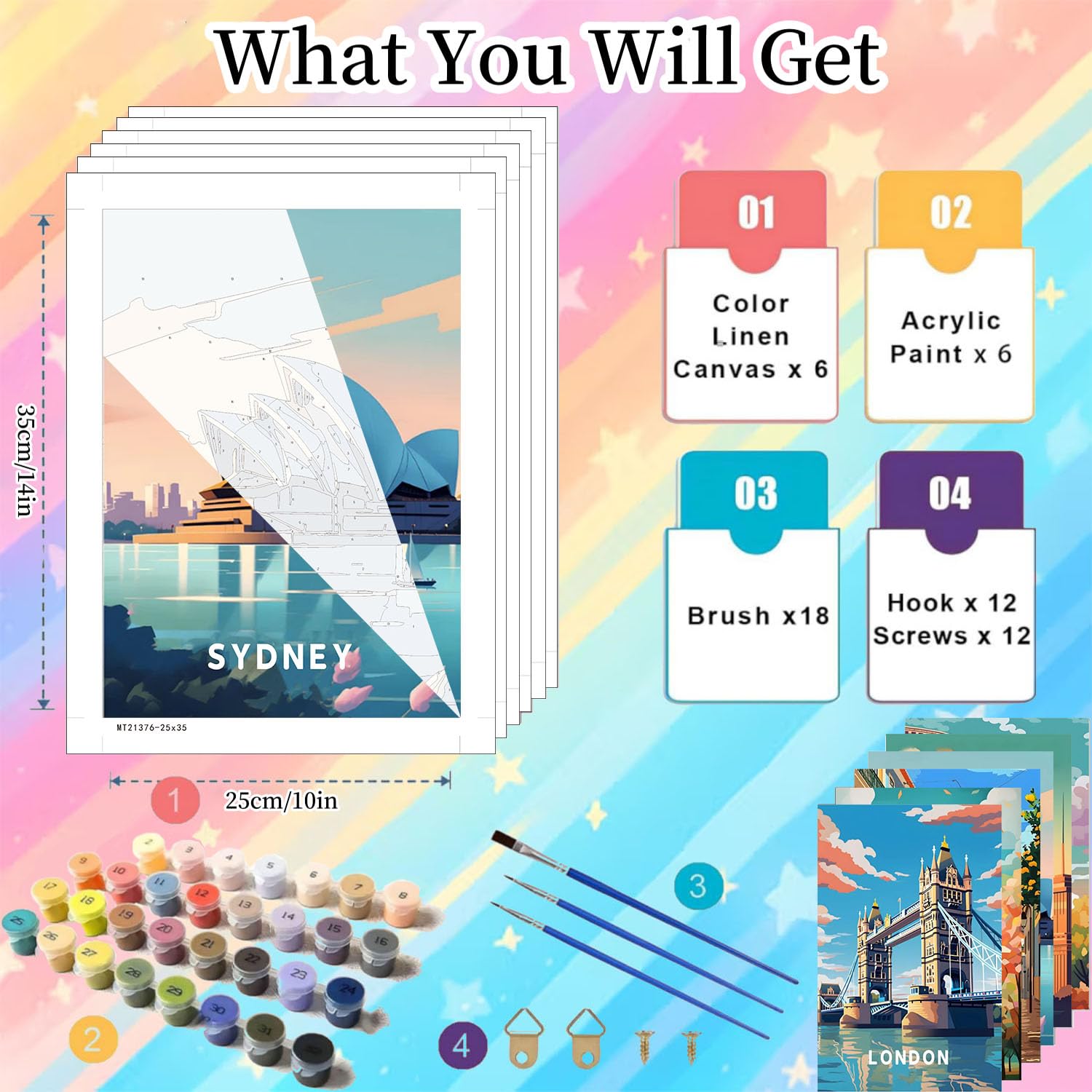 6 Pack Paint by Numbers Kit for Adults Beginners-Easy City Travel Adult Paint by Number Kits on Canvas, DIY Acrylic Oil Painting by Numbers for Adults Without Frame for Gift Home Wall Decor(10x14inch)