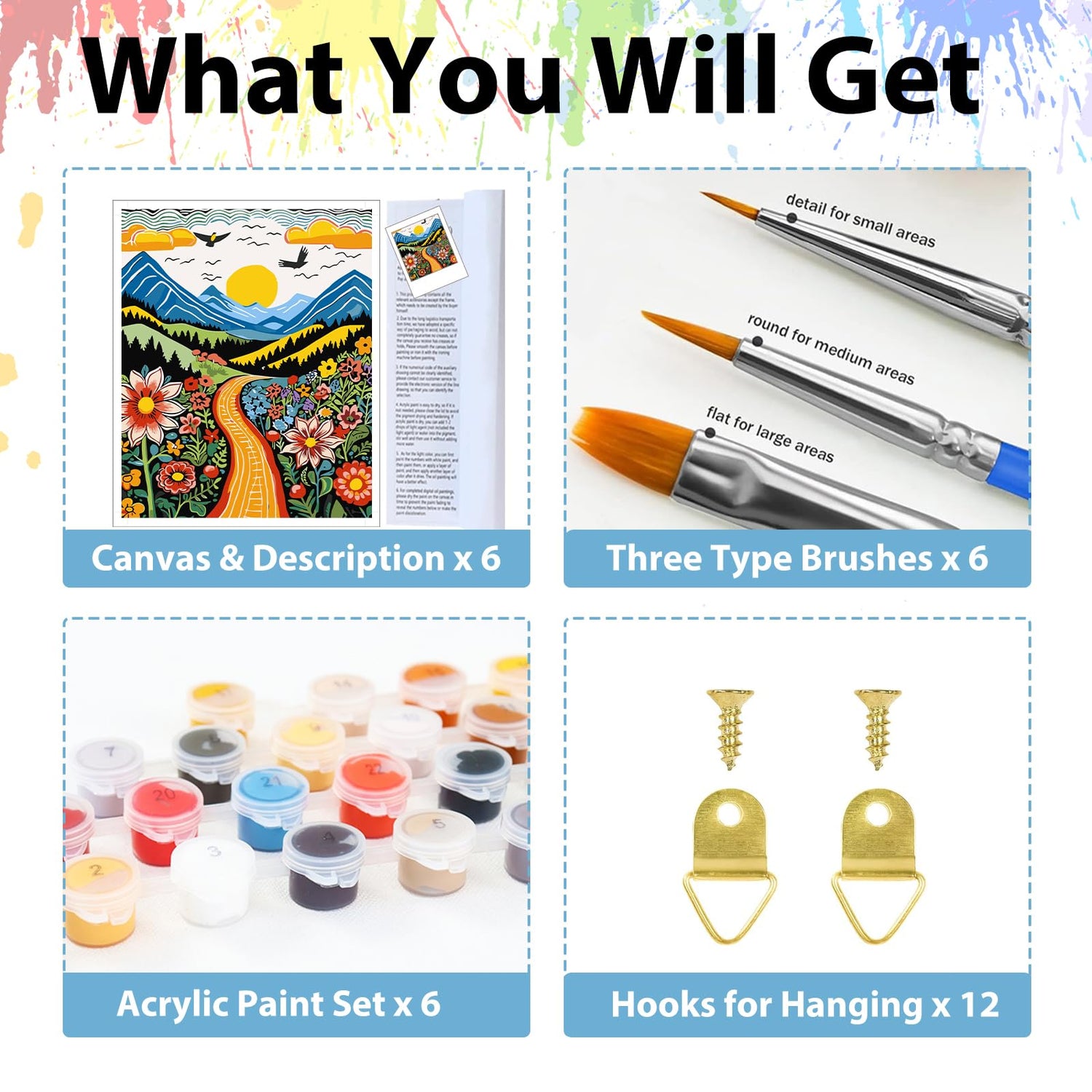 - What You Get: With paint by numbers for adults, you will get: 6x HD waterproof canvas, 6x perfectly matched acrylic paints,6 set of high-quality brushes (including large and small brushes), and reference pictures of finished products.