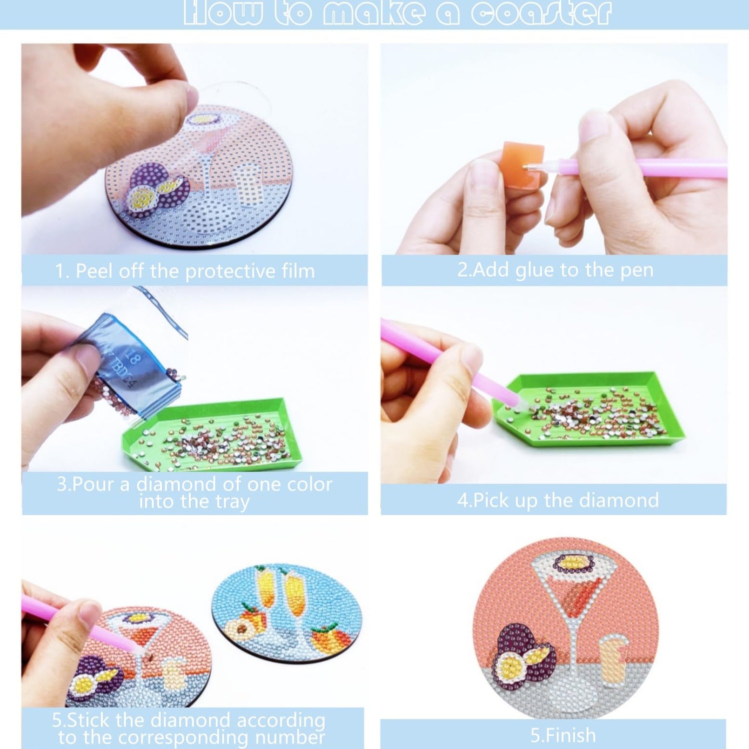 - Diamond Painting Coasters kits:You will get 6 pieces of diamond art coasters,1 coaster holder and DIY tools: trays, glue, pens, etc. The diamond art coaster kit meets your DIY needs and is perfect for DIY fun with family and friends