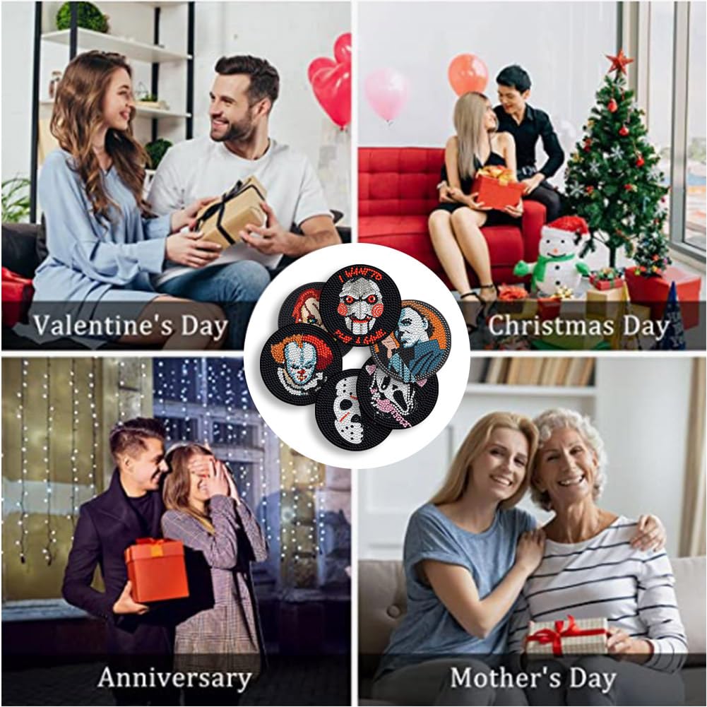 6 PCS Diamond Painting Coasters Kits with Holder Horror Halloween, DIY Funny Jack Skull Diamond Art Coaster Sets for Beginners Adults and Kids Art Craft Supplies Holiday Gift