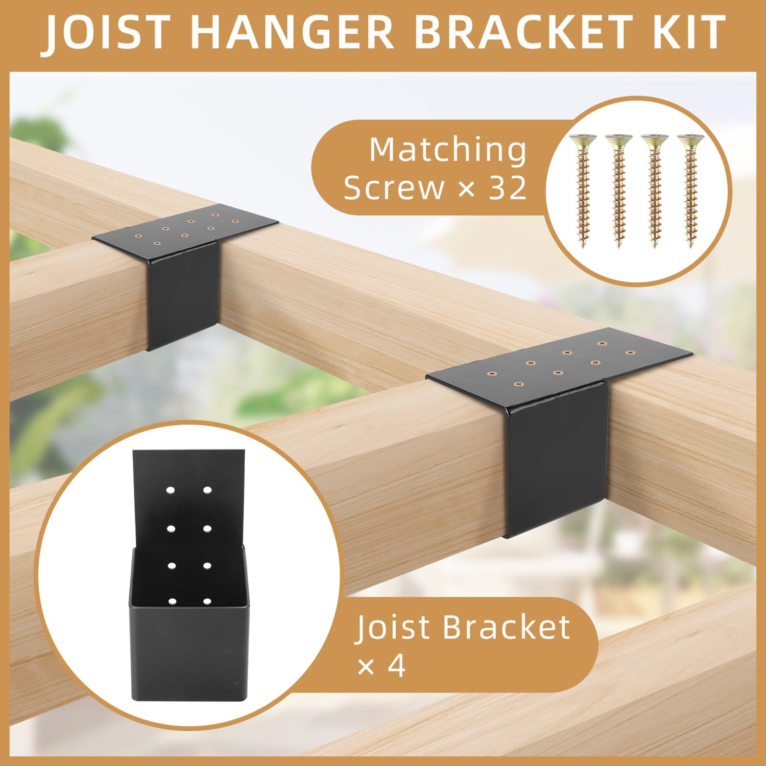 - EFFORTLESS INSTALLATION: You will receive 6 pcs pre-drilled 4" x 4" pergola brackets and 48 pcs matching screws. You only need to insert and secure the wood post into the bracket first, then slide the other end of the bracket into the joist, and finally tighten the screws.