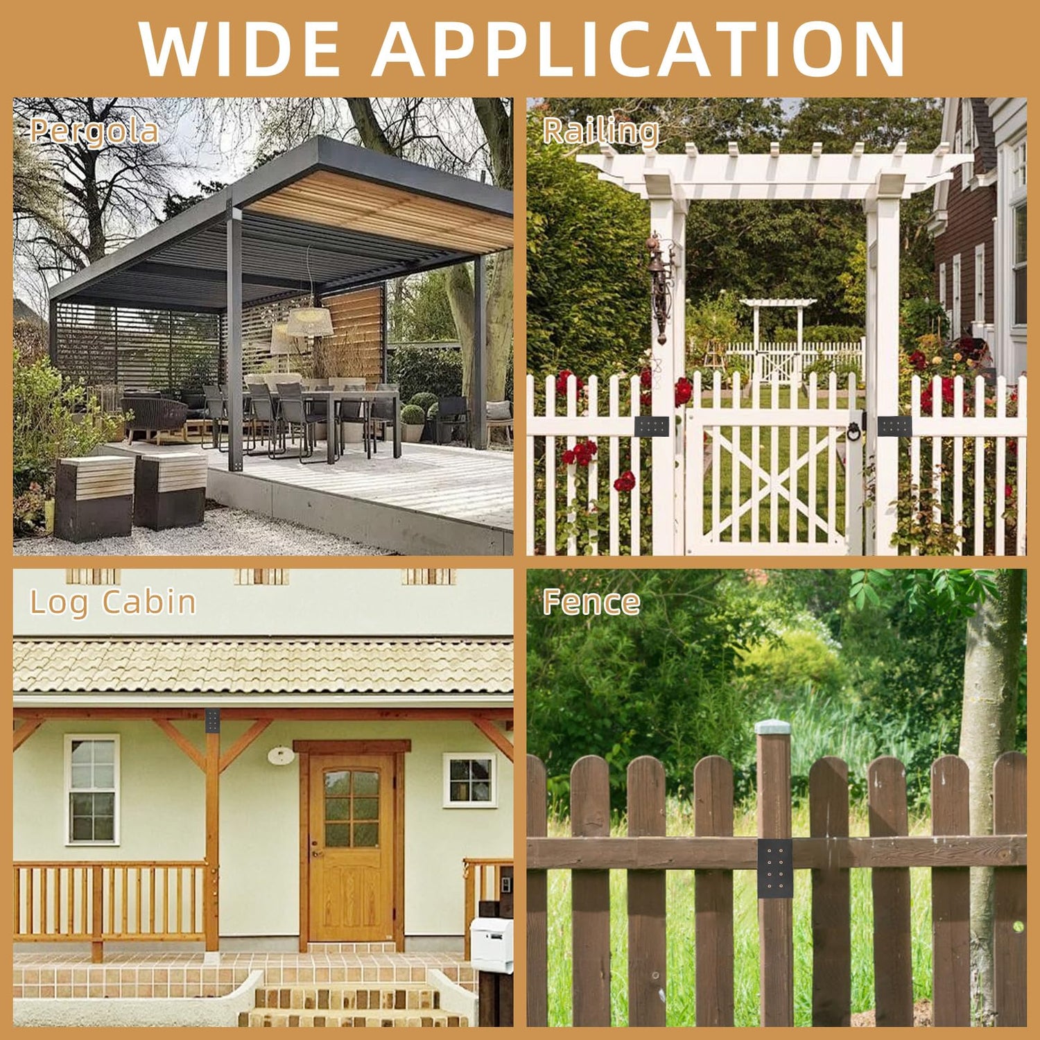- VERSATILE APPLICATION: As a stable support kit, this beam connector can be installed on the end of the beam, handrail, railing, and fence. They are widely used to build pergolas, gazebos, carports, treehouses, log cabins, barns, swings, etc.