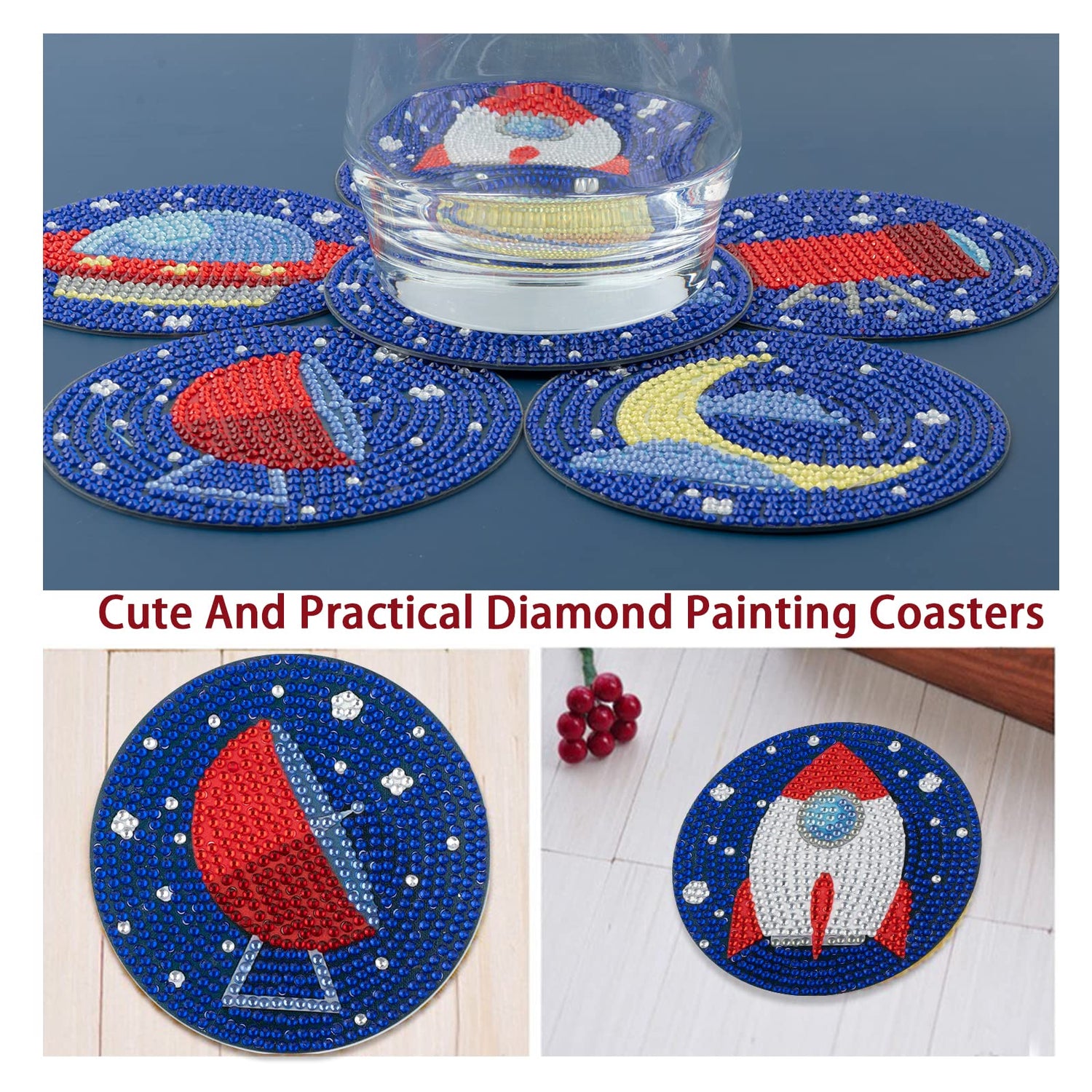 6 Pcs Starry Sky Diamond Art Acrylic Coasters with Cork Base and Holder, DIY 5D Diamond Painting Coasters Kit for Adults, Planet Rocket Moon Spaceship Design, Creative Table Decor Crafts