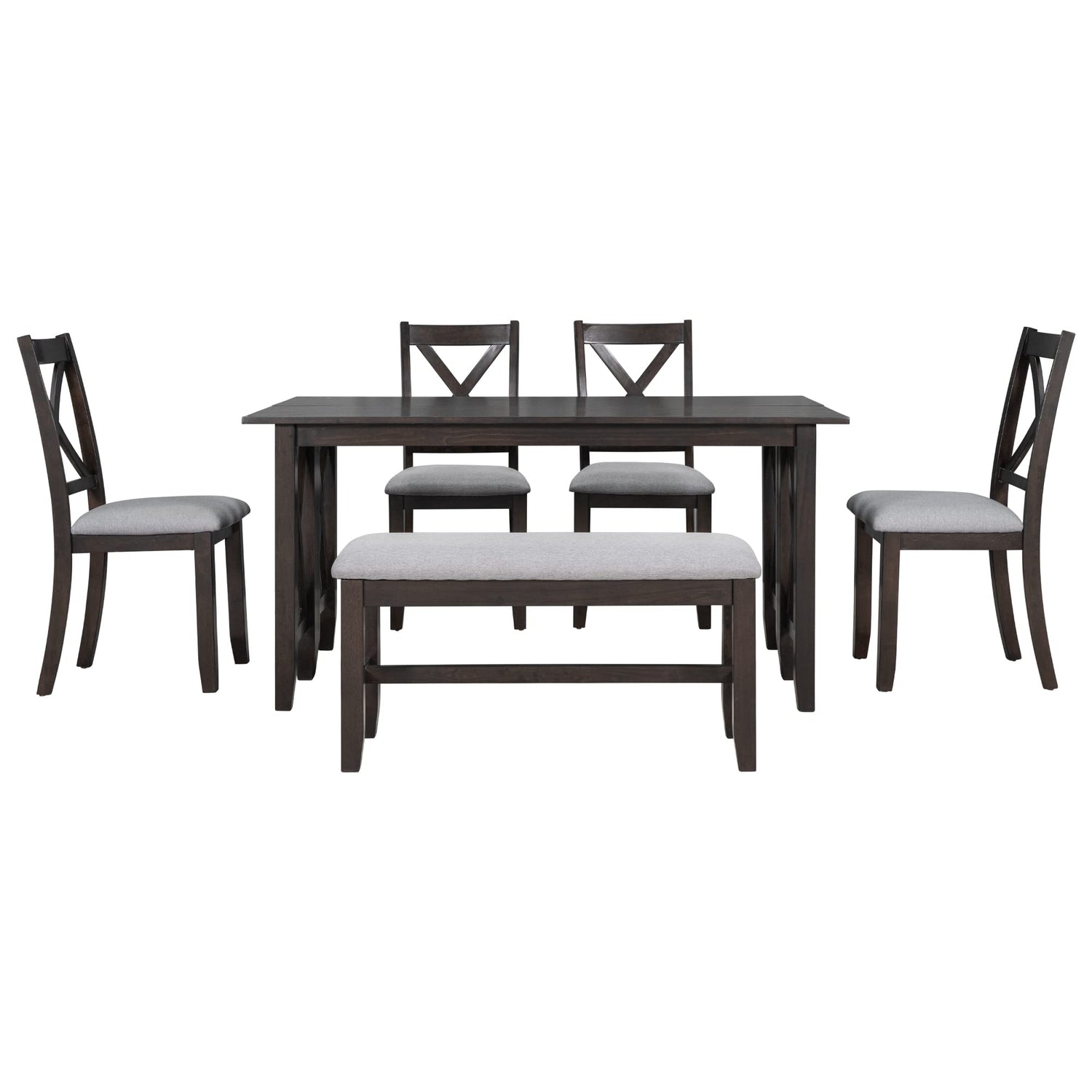 6 Piece Dining Room Table Set, Rustic Farmhouse Dining Room Foldable Table with 4 Upholstered Chairs and Bench, Solid Wood Kitchen Dining Table Set for 6 Persons (Espresso)